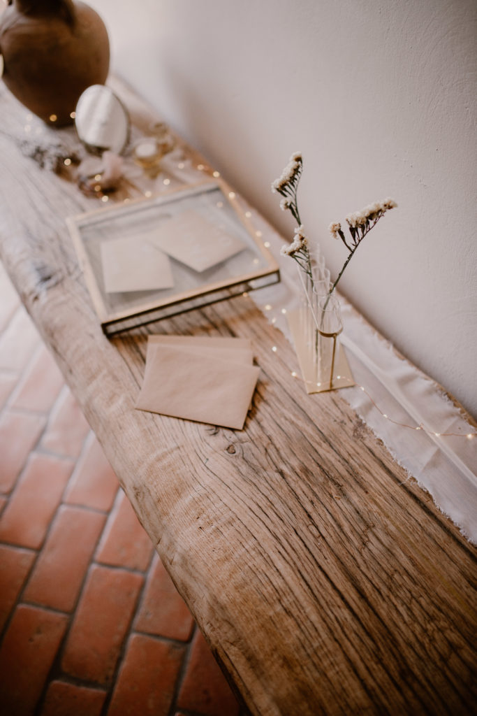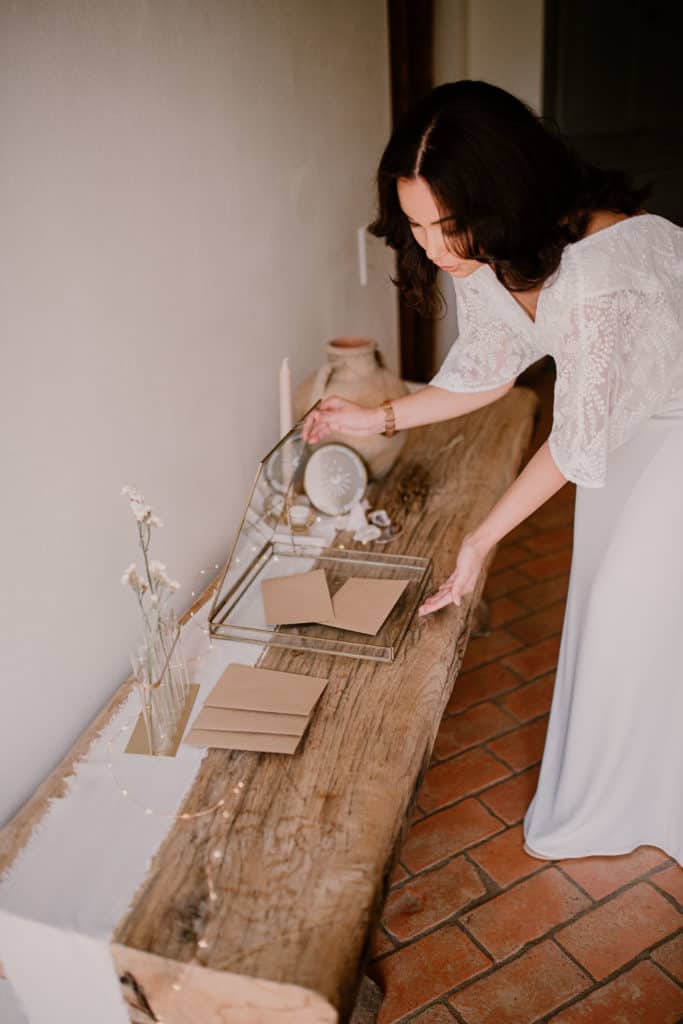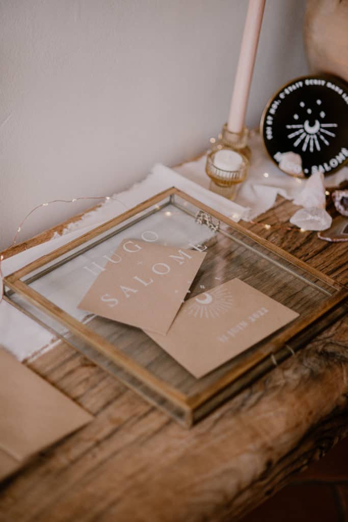 La boîte est personnalisée des prénoms des mariés ainsi que la date de l’événement. Laissez ensuite vos convives glisser de belles enveloppes kraft à l’intérieur.