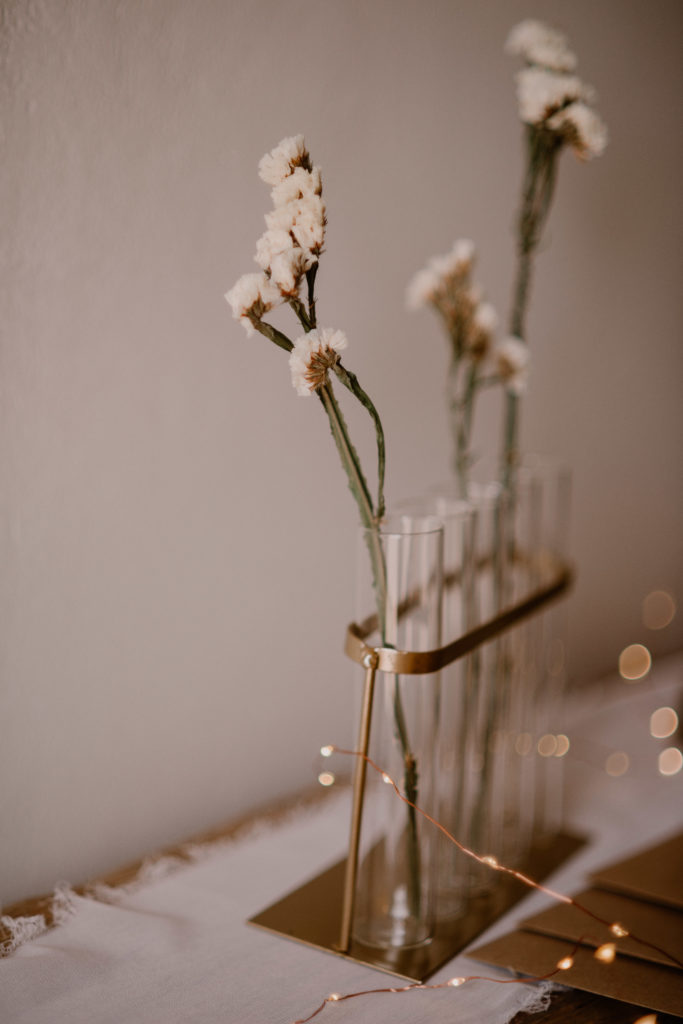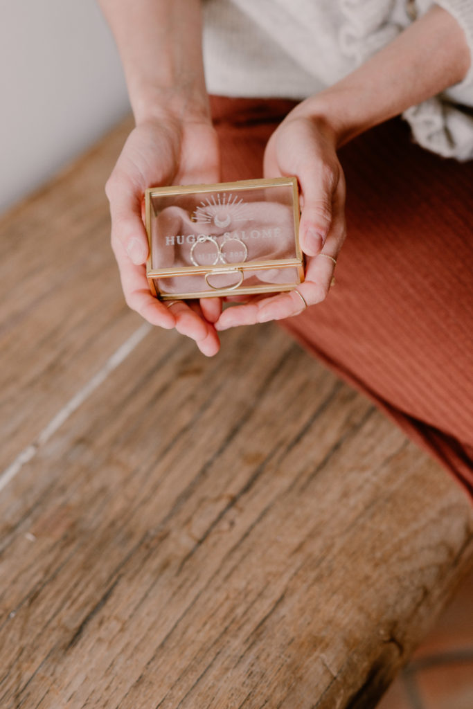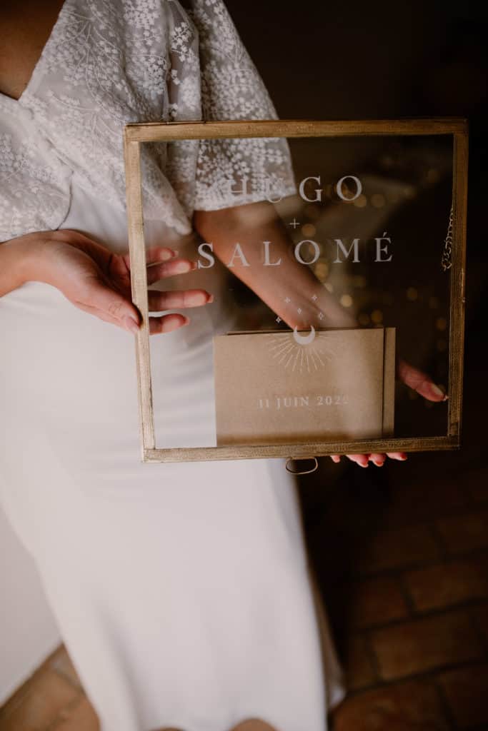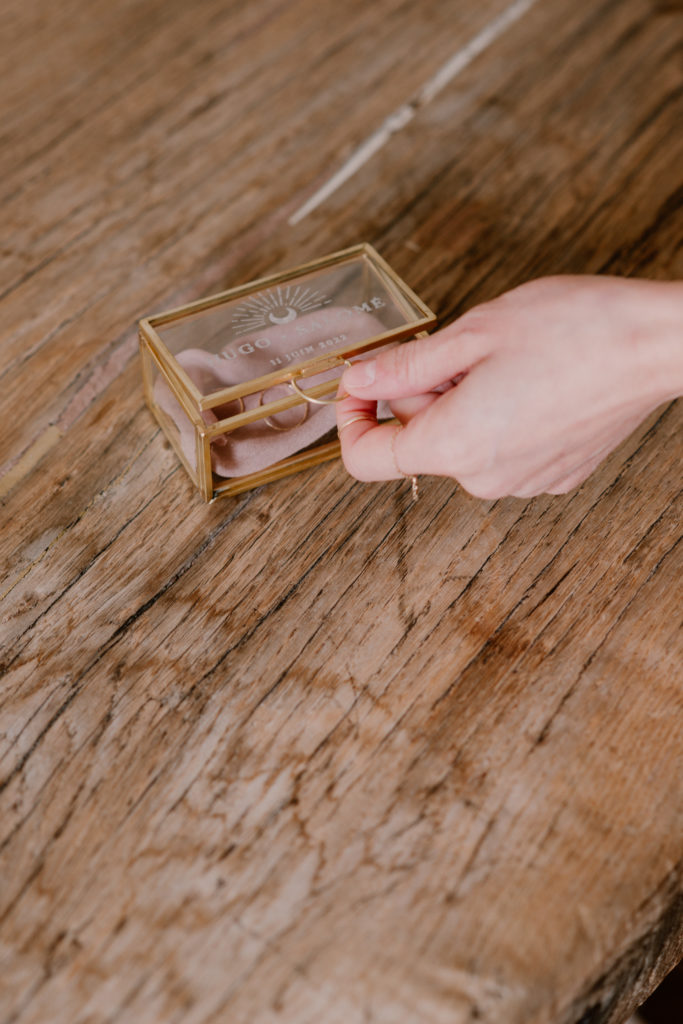 La boîte à alliances représente ce moment très important d’échange des vœux des mariés. Il est donc important de ne pas bâcler cet instant. Nous avons décidé de proposer une jolie boîte à alliances en verre et jolie dorure. On aime son aspect personnalisable qui laisse ouvert le champ des possibles. A l’intérieur, n’hésitez pas à nicher vos alliances dans un petit rectangle en mousseline de coton de la couleur du thème de votre mariage.