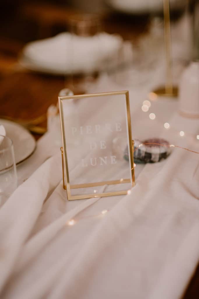 Ensuite, sur la table en elle-même, nommée « Pierre de Lune », un joli cadre doré illustre cette tablée.