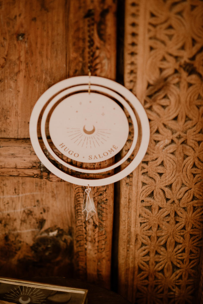 Le cercle central est gravé d’une lune rayonnante et d’étoiles, et est personnalisable avec les prénoms des mariés. Une pampille en forme de pointe de cristal gravé est suspendue en dessous.