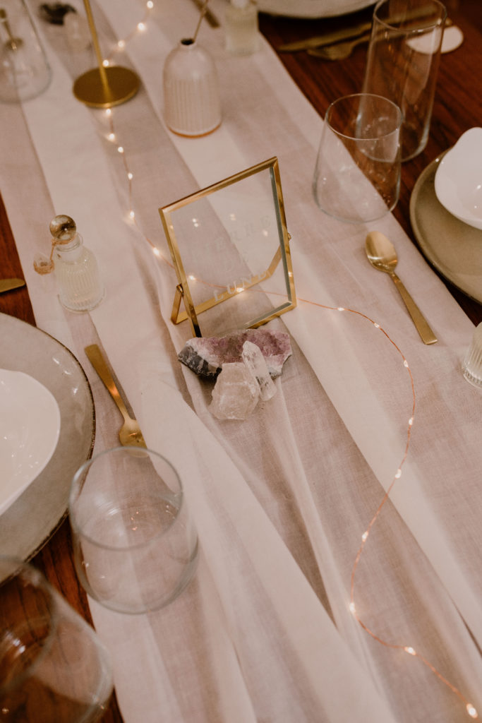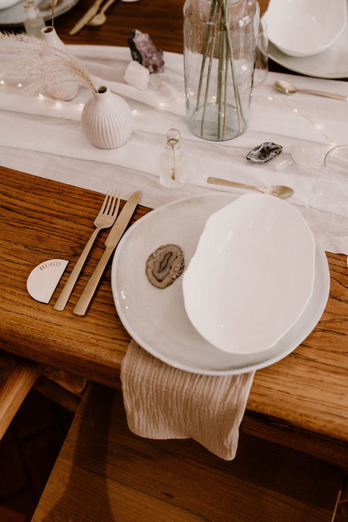 Option 2 : Disposez une jolie pierre semi-précieuse. Le thème ésotérique sera d’autant plus bien mis en valeur et les couleurs des pierres se marient parfaitement bien avec les serviettes, la table en bois et les couverts dorés.