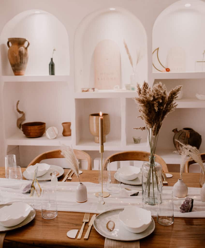 Différentes hauteurs de vases sont éparpillées sur la table. De quoi créer un joli volume.