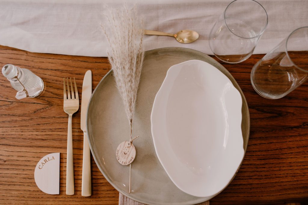 Les places des convives sont matérialisées par de jolis marque-places en bois personnalisables en forme d’arche. Plusieurs choix s’offrent à vous pour décorer vos assiettes!