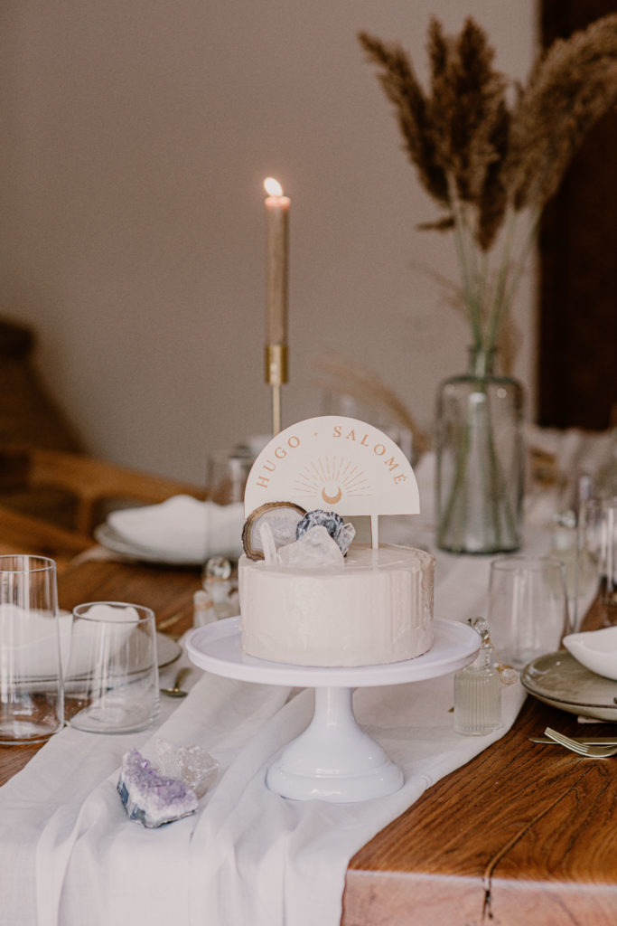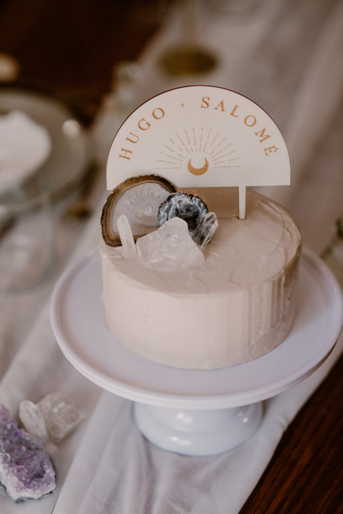 Sur le dessus, nous avons placé de belles pierres semi-précieuses et un joli cake topper en bois personnalisable.
