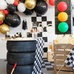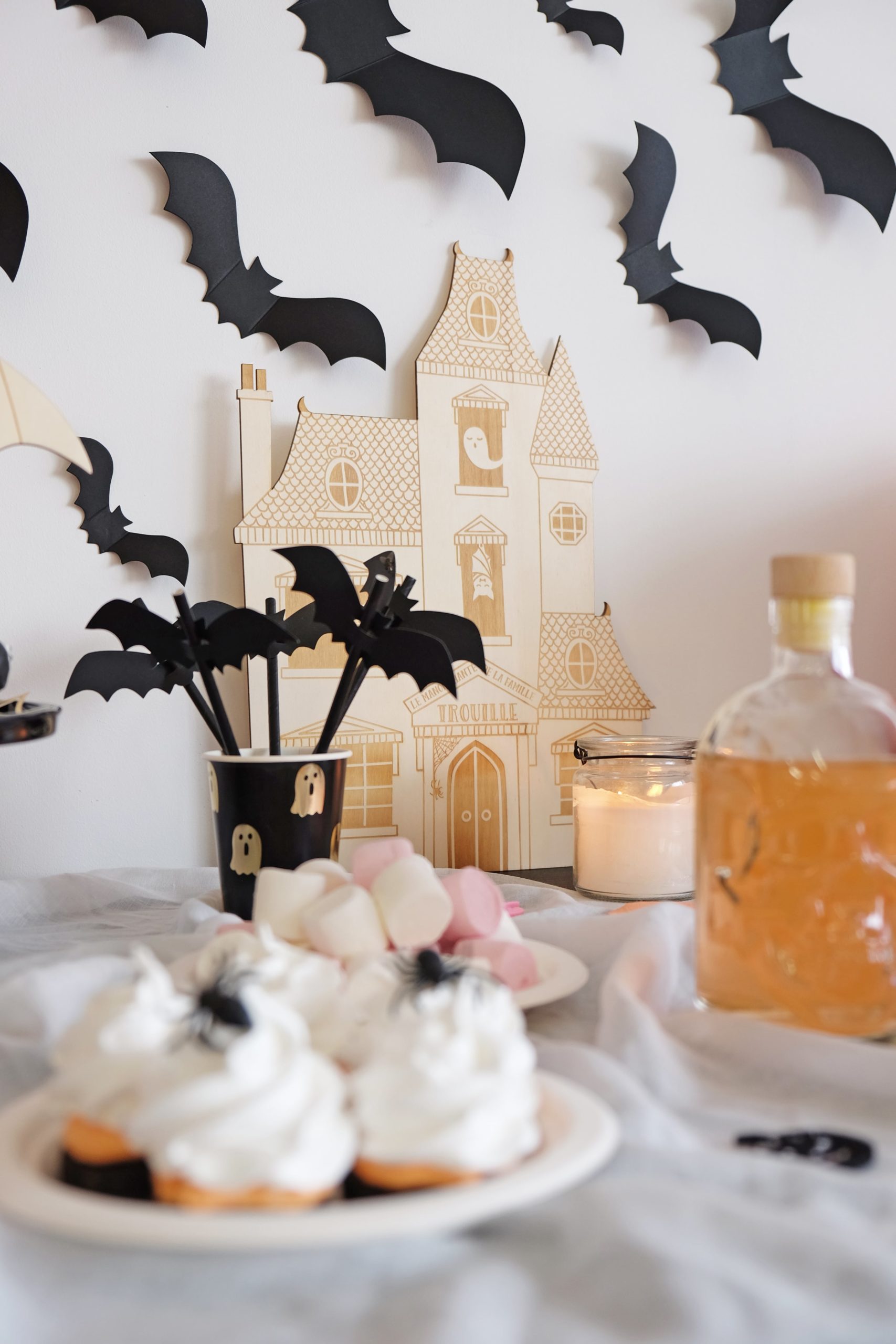 La guirlande de notre kit Halloween est fixée au dessus de notre table. En fonction du style recherché, elle peut être modulée de différentes façons. Pour entrer un peu plus dans le thème, le kit contient de la toile d’araignée et des araignées. Nous l’avons placé de manière à pouvoir y ajouter nos beaux stickers Chauve souris.