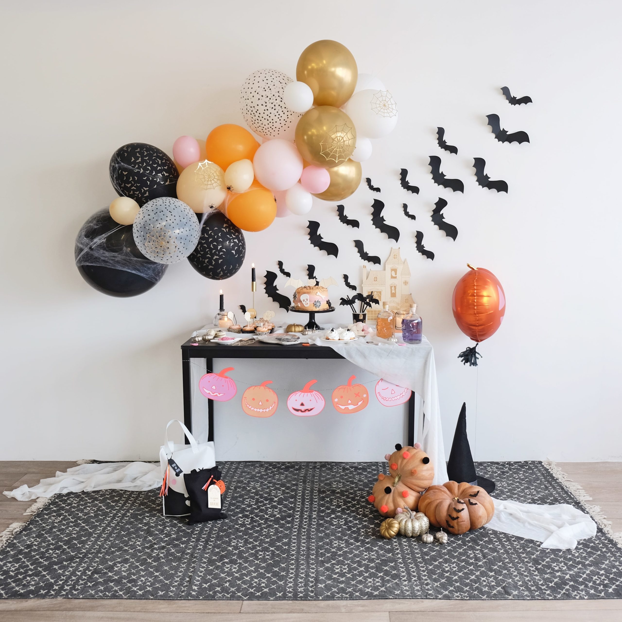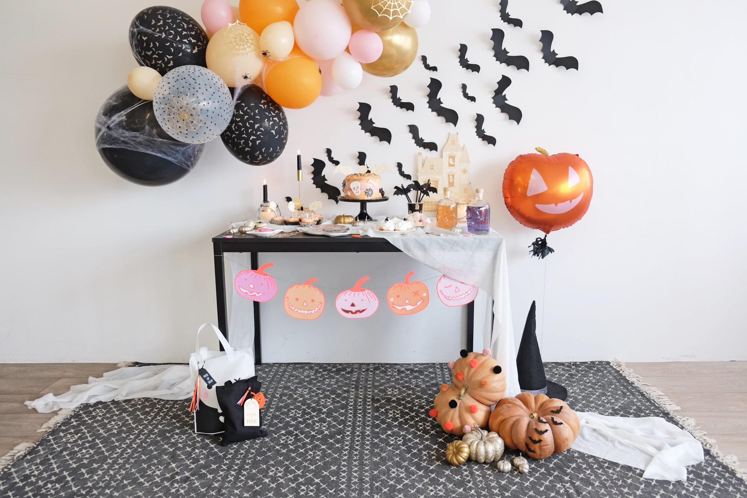 Pour l’installation de cette mise en scène d’halloween, nous avons réutilisé un tapis, une table foncée et le mur blanc de la pièce. Il sera très facile de reproduire l’ambiance à l’intérieur d’une maison ou un appartement en réutilisant les meubles déjà disponibles. (Notre home sweet home regorge de pépites 🙂 )
