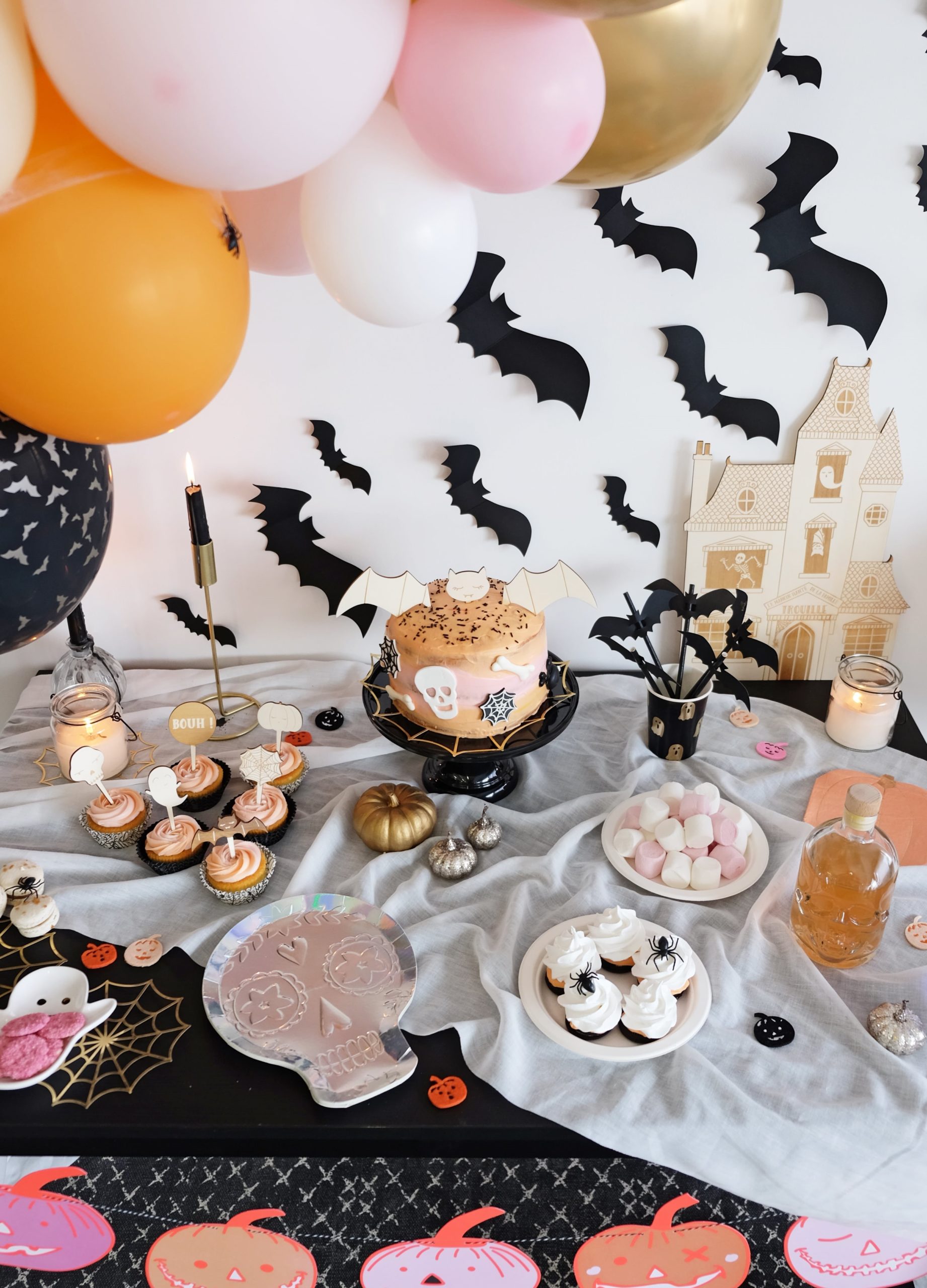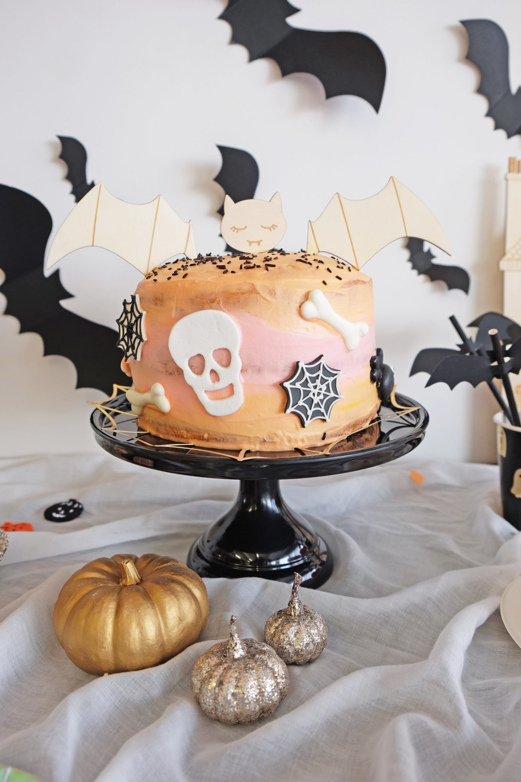 On fond de délice pour notre gâteau Spécial Halloween réalisé par notre Cheffe Christelle ! Il repose sur un support à gâteau noir . Piqué sur le dessus, des pics de chauve souris en bois . Sur la crème, des décorations en sucre. Le glaçage est en rose et orange pastel. Pour ne rien vous cacher il est aussi beau que bon. Enfin, sous le gâteau, une toile d’araignée dorée. (C’est un lot que l’on retrouve également sur notre table)