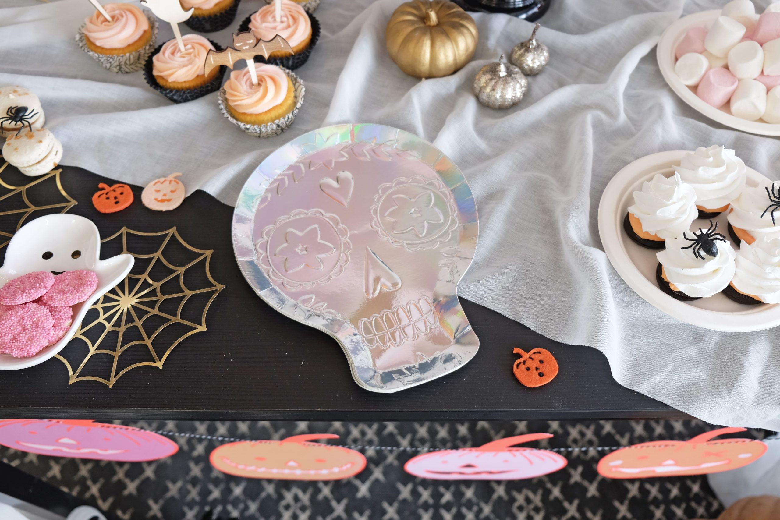Pour finir de faire plaisir aux plus gourmands, dans les assiettes blanches écologiques des biscuits meringués et marshmallows. Des macarons saveur « fantômes » décorés avec nos fidèles araignées directement sur le chemin de table. Enfin, dans le bol en céramique fantôme, des CHOCOLATS !!! Pour servir tout ce petit monde, les assiettes têtes de mort sont parfaites! En plus, elles peuvent servir d’élément de décoration parce qu’elles sont vraiment trop wahouuuu.