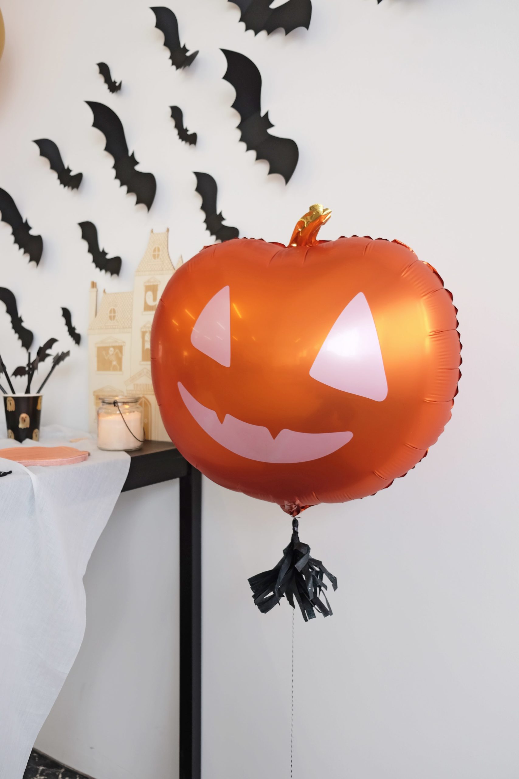 Toujours plus de fun et tendance! Ce ballon citrouille est parfait! Ici il est accroché au chapeau de sorcière d’Halloween utilisé en accessoire de décoration.