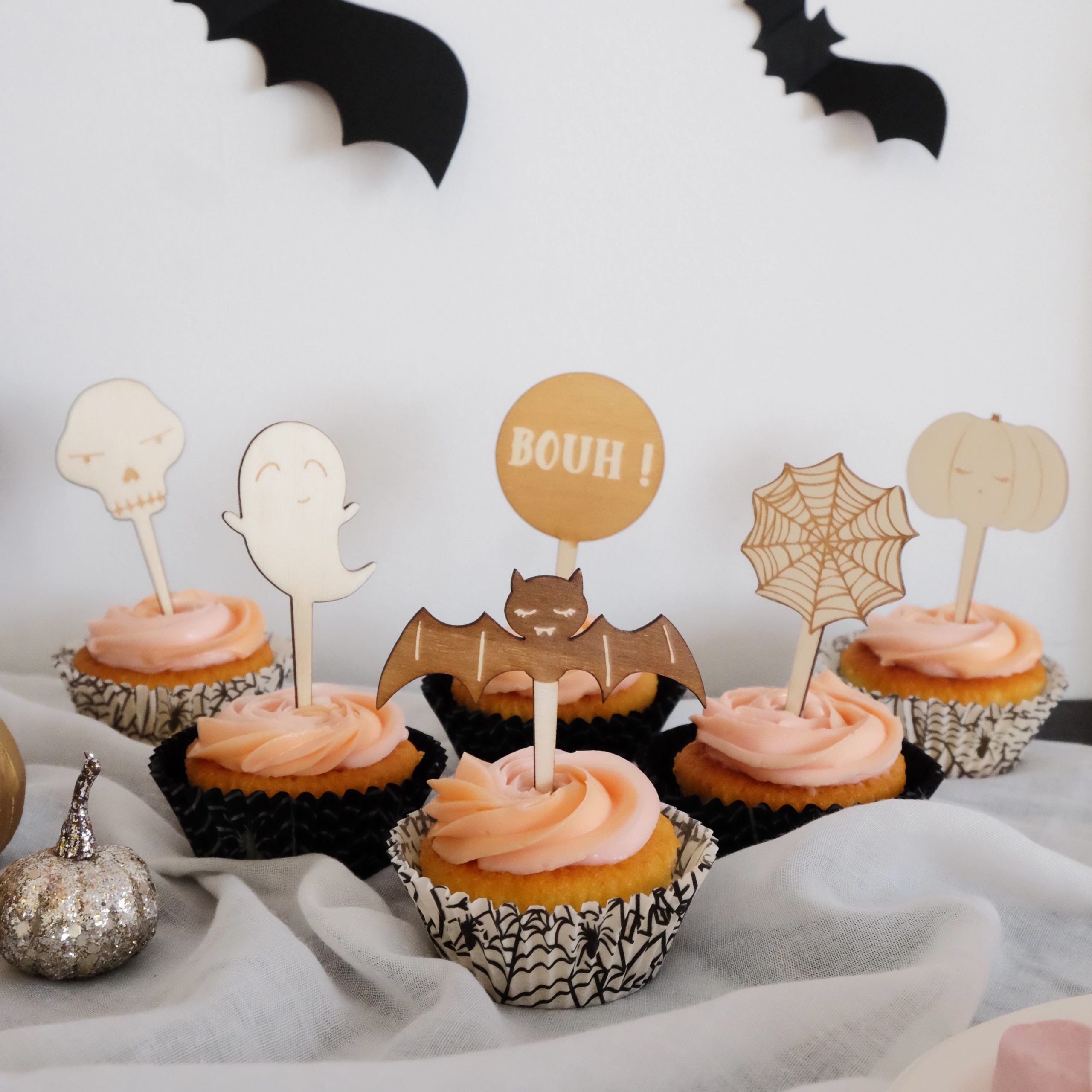 La régalade ne s’arrête pas là. Pour continuer les festivités, nous vous proposons de bons cupcakes présentés dans leurs caissettes d’Halloween et décorés avec les beaux pics en bois d’Halloween.
