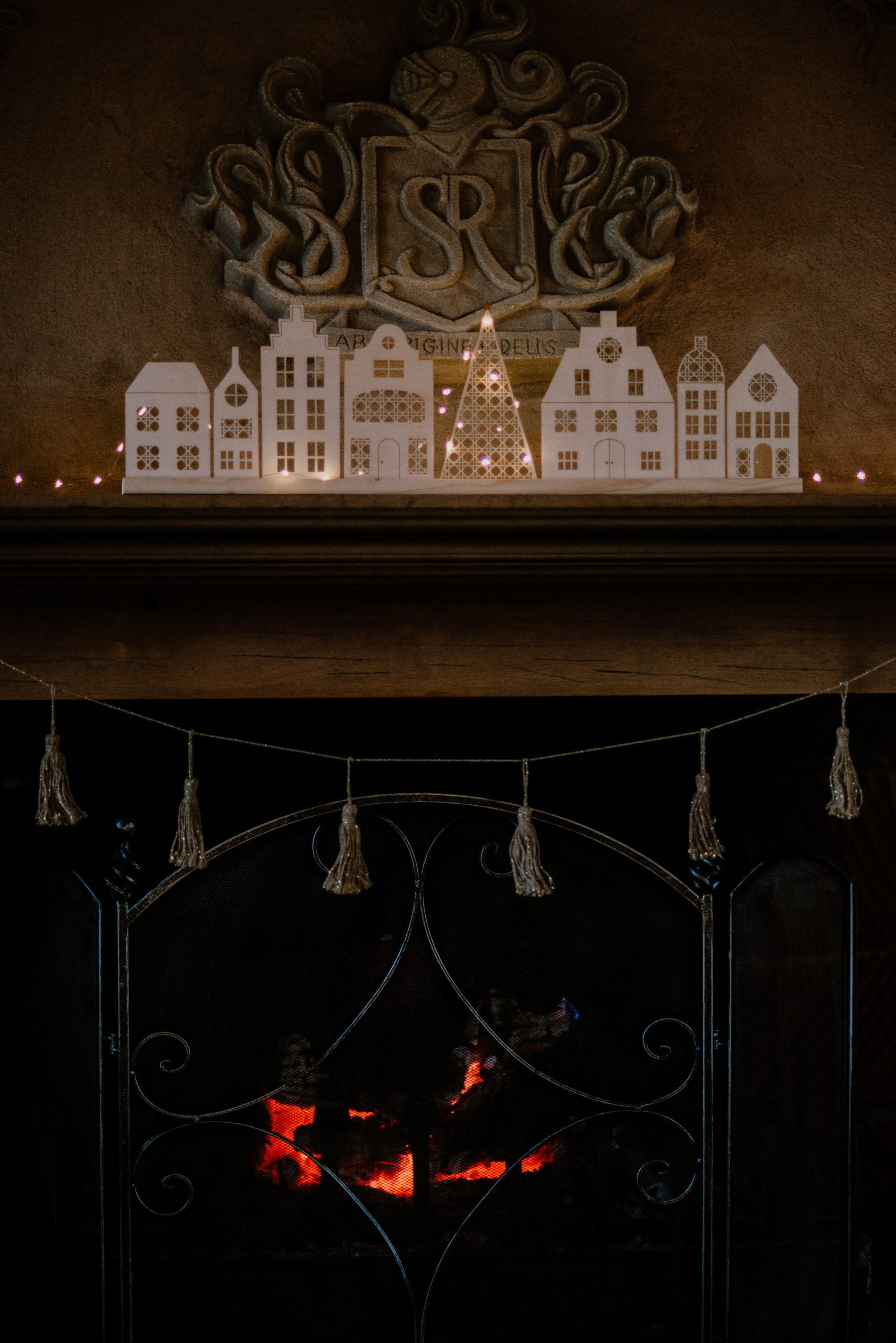 La cheminée est décorée avec une très belle décoration en forme de village de Noël. Elle est composé de plusieurs maisons d’inspiration nordique et d’un beau sapin. Certains détails sont gravés et d’autres sont découpés, avec par endroit un motif de cannage.
