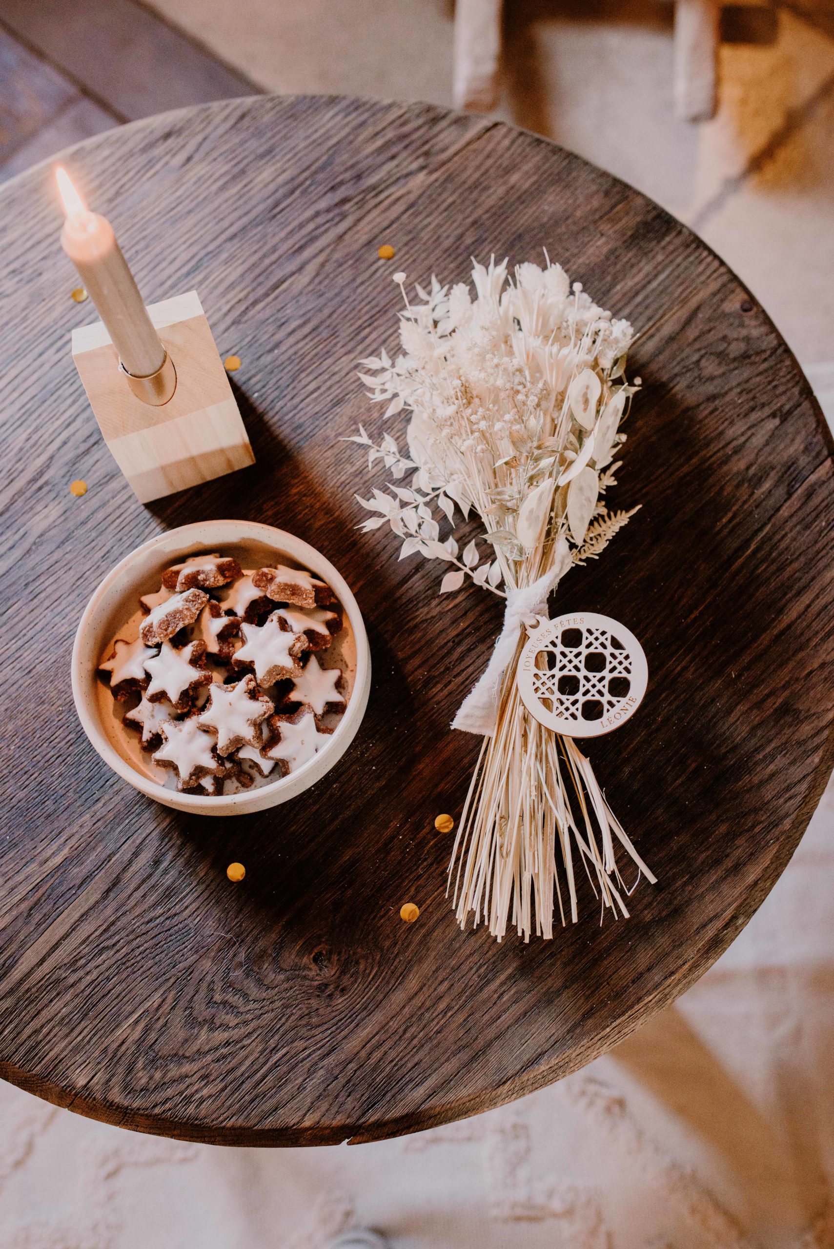 La table basse du salon accueille de bons biscuits à la cannelle. Mais aussi, un beau bouquet de Noël. Celui-ci est décoré d’un ruban en mousseline blanc et d’une étiquette en bois personnalisable, (en forme de boule de Noël et au motif de cannage découpé) ainsi qu’un bougeoir nordique et son cierge ivoire.