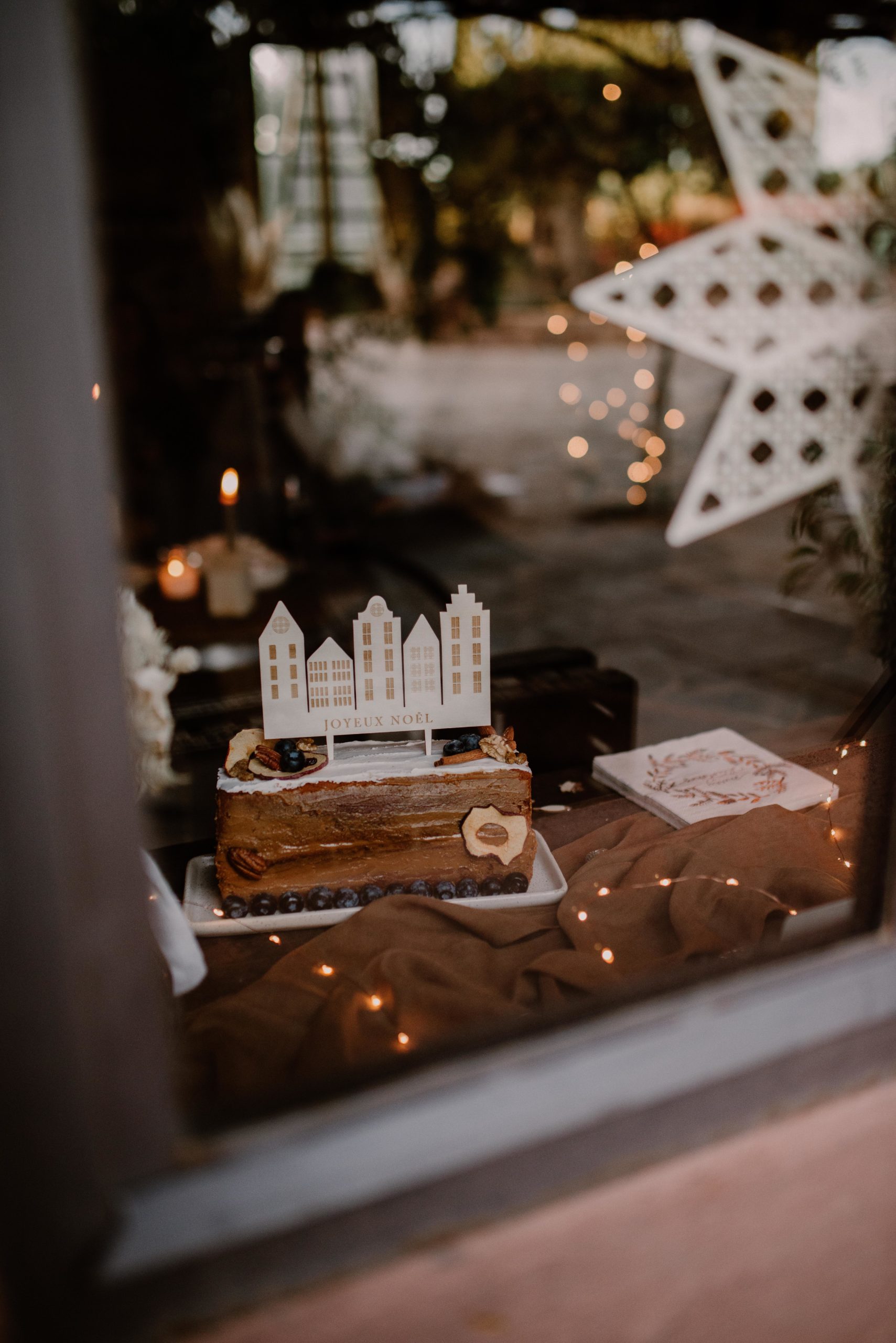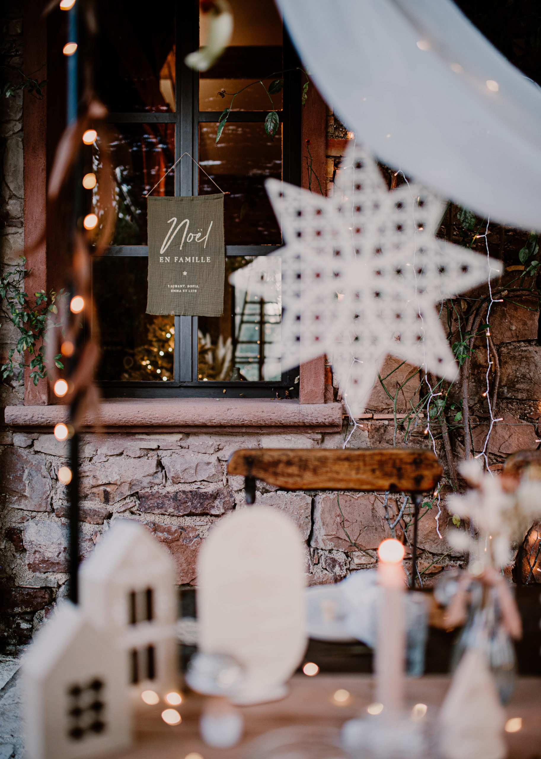 En fond, suspendu sur le mur derrière la table, une guirlande rideau lumineuse.