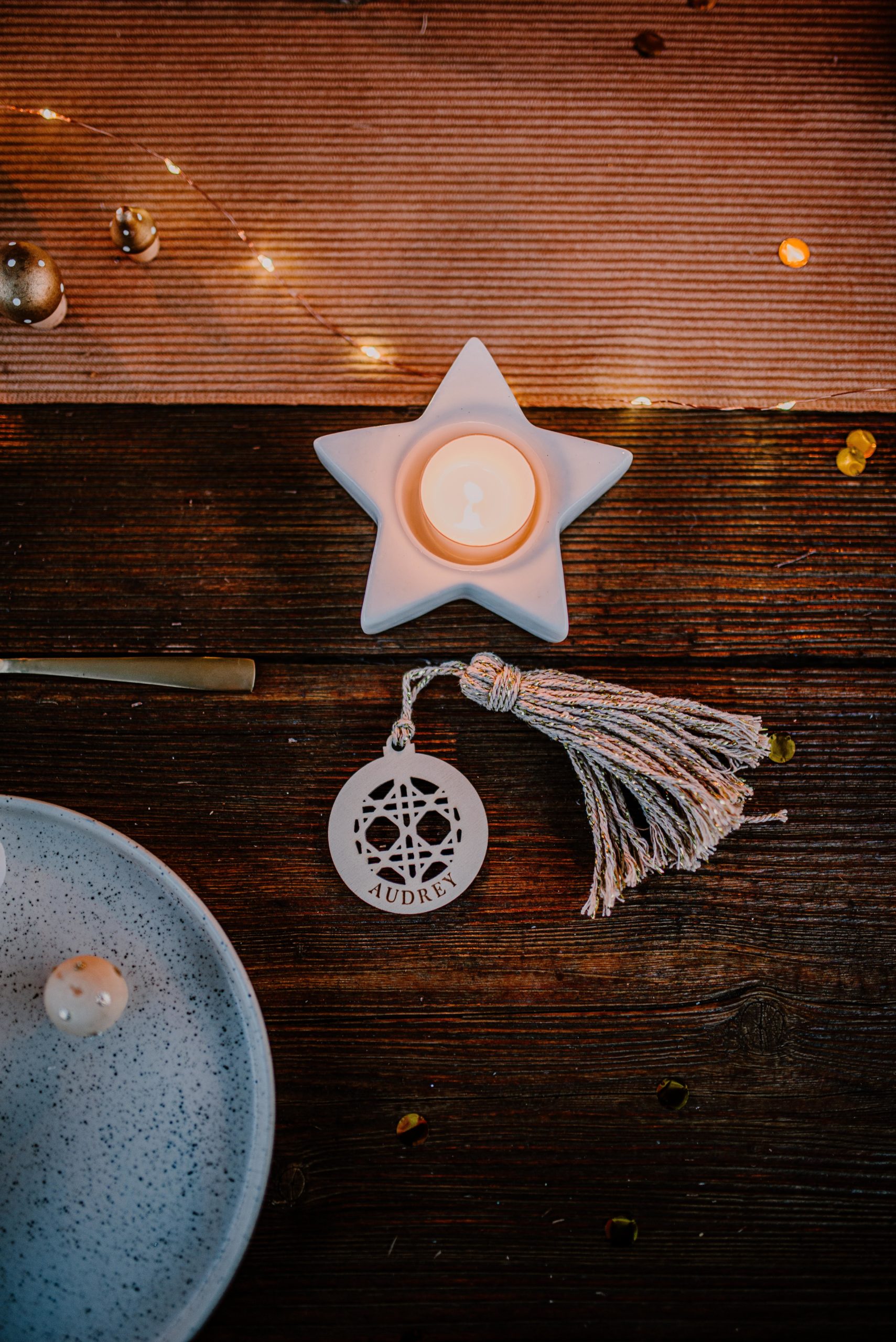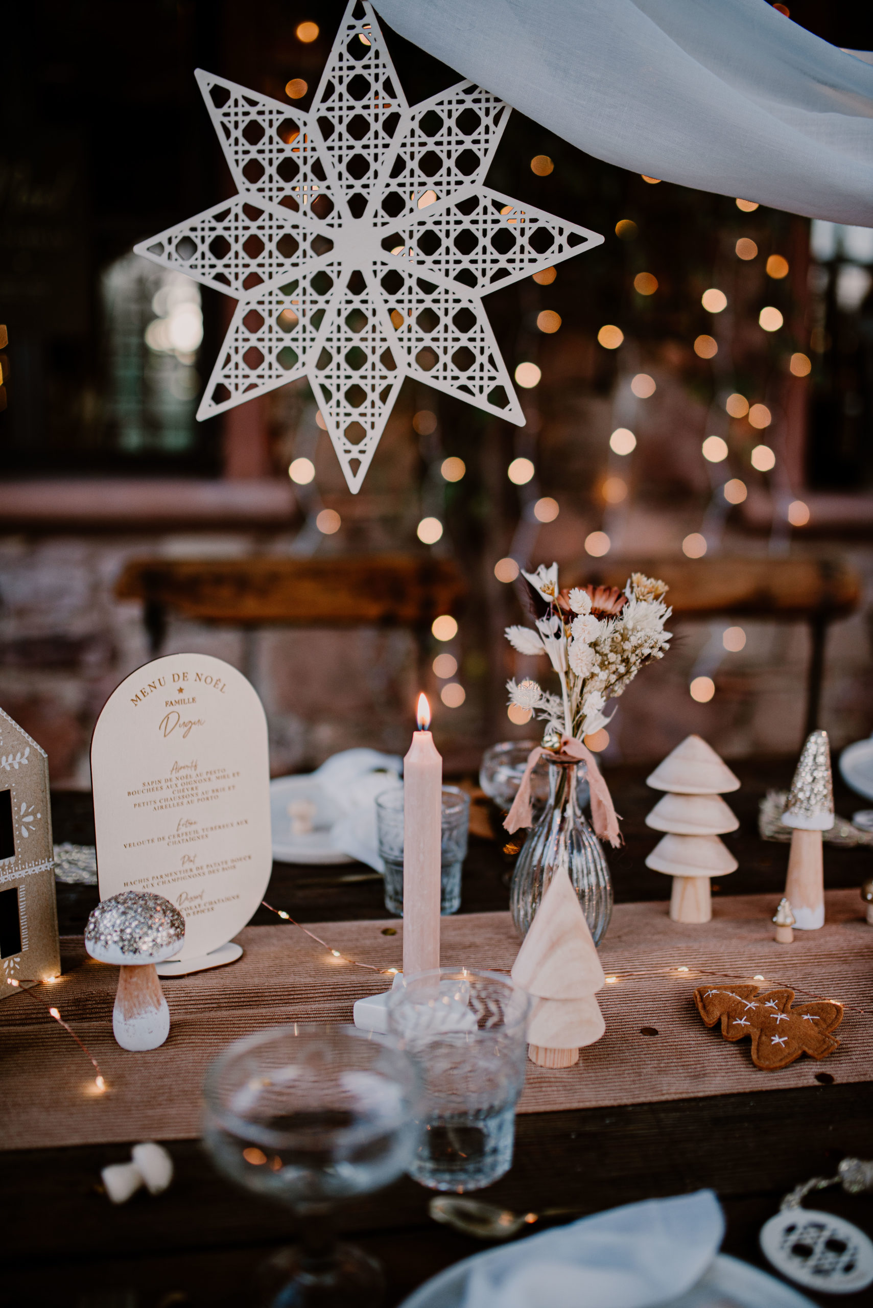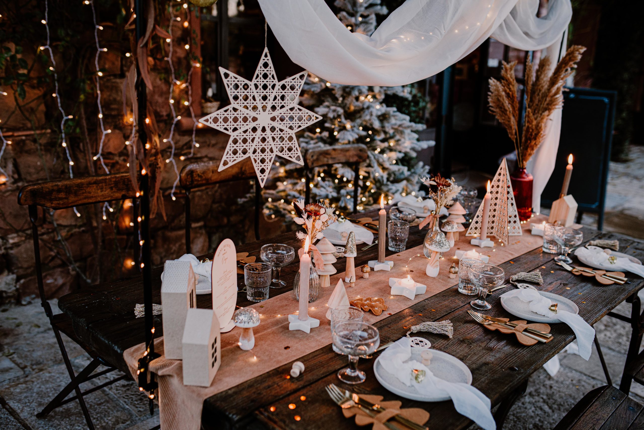 La somptueuse table en bois était parfaite pour l’occasion, avec ses chaises assorties. Elle est dressée pour six personnes. Pour commencer, il a fallu placer l’arche de table noire au dessus de la table. Elle se fixe facilement et s’emboite. Sur celle-ci, repose un drapé habilement déposé au bout duquel est suspendu l’étoile en cannage. Nous y avons ajouté une guirlande lumineuse. L’effet lumineux est garanti.