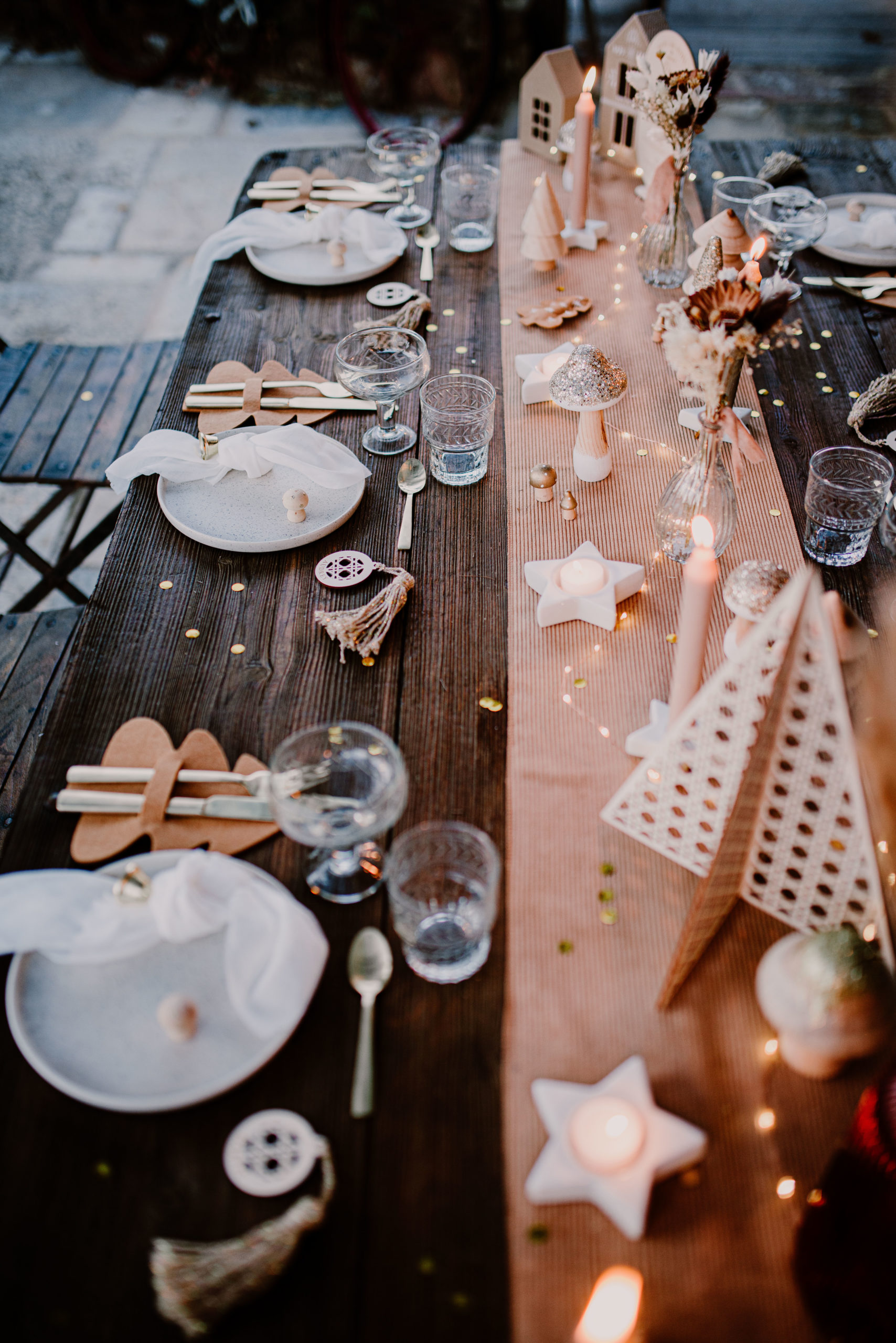A gauche, des petites maisons façon scandinaves sont placées à proximité du menu. Elles sont décorées au Posca. Sur la partie de droite, un sapin en cannage est installé avec les autres décorations sur le centre de table. Le tout, est parsemé de petits confettis dorés.