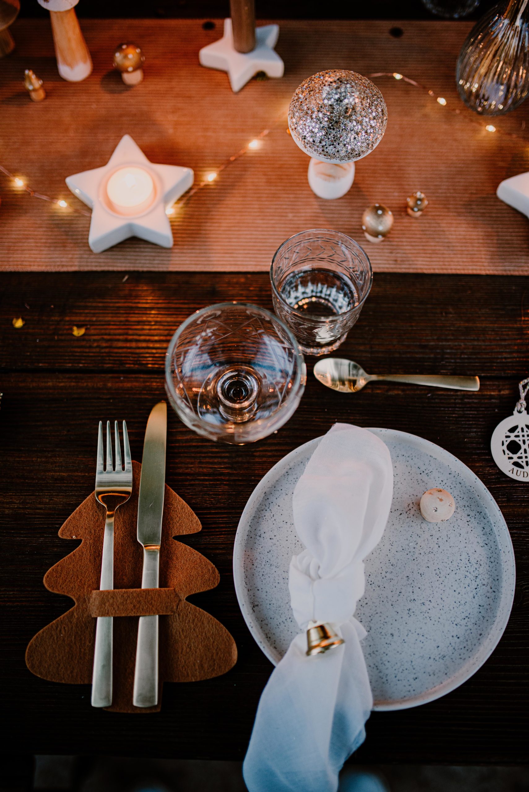 Les couverts sont placés dans de ravissants portes couverts sapins en feutrine caramel. Les serviettes blanches sont nouées avec des petites clochettes au centre des assiettes.
