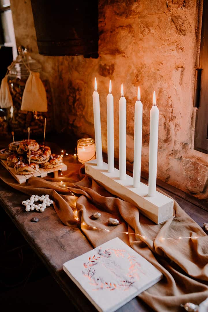 Au milieu, est disposé un bougeoir scandinave en bois. Il contient 5 bougies.