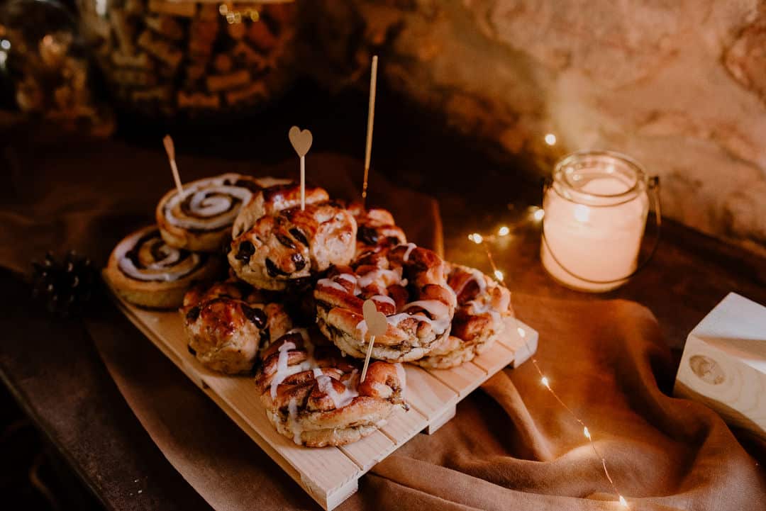 Les petits cœurs paillettes dorés sont piqués dans nos bonnes brioches et roulés à la cannelle.