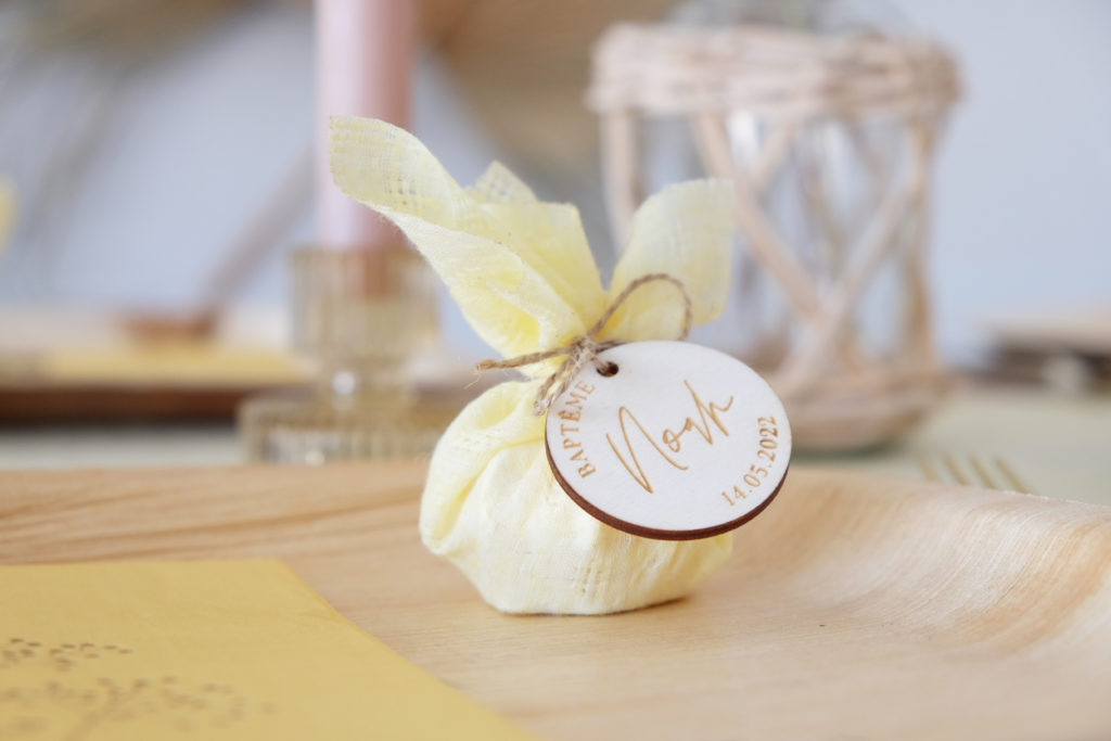 Sur chaque place, un petit pochon en tissu jaune attend vos invités ! Parfait à garnir de dragées, de thé, de bonbons…