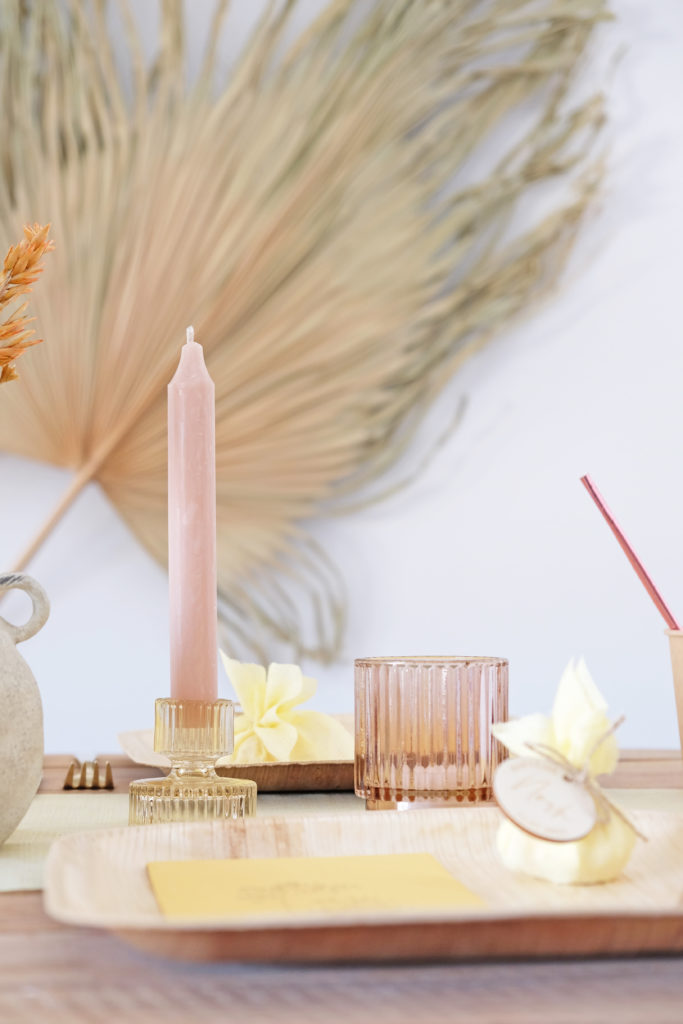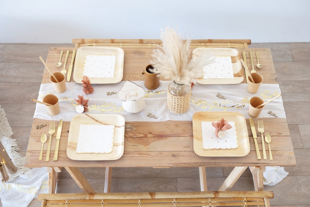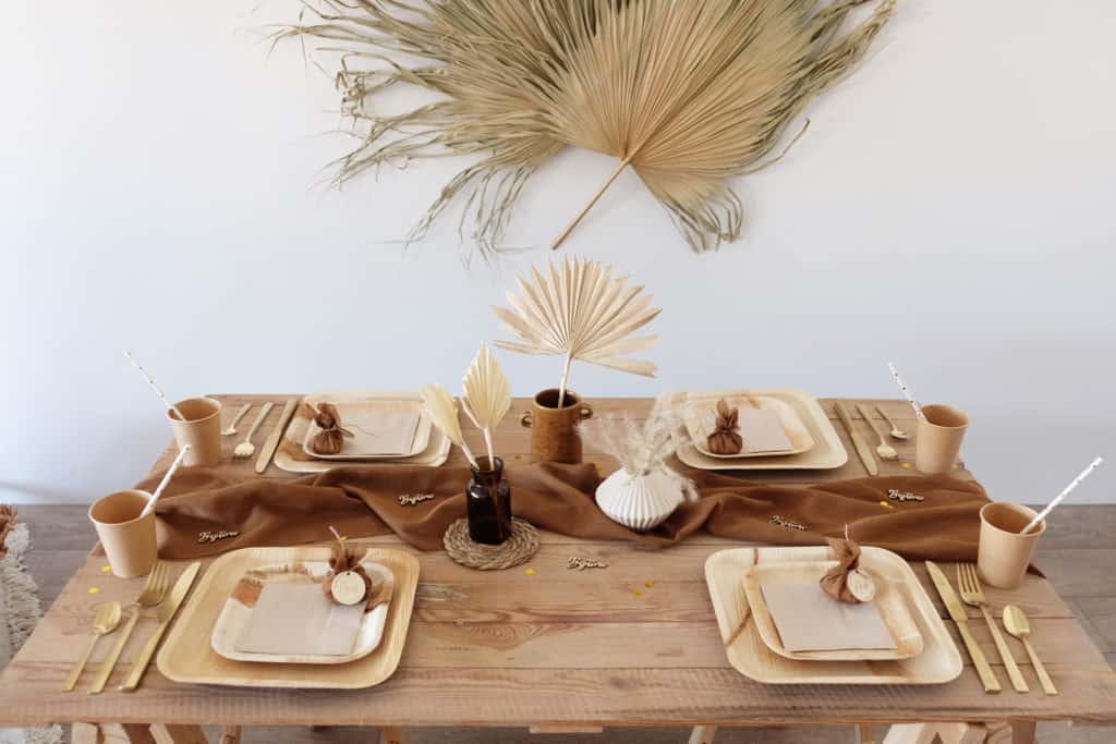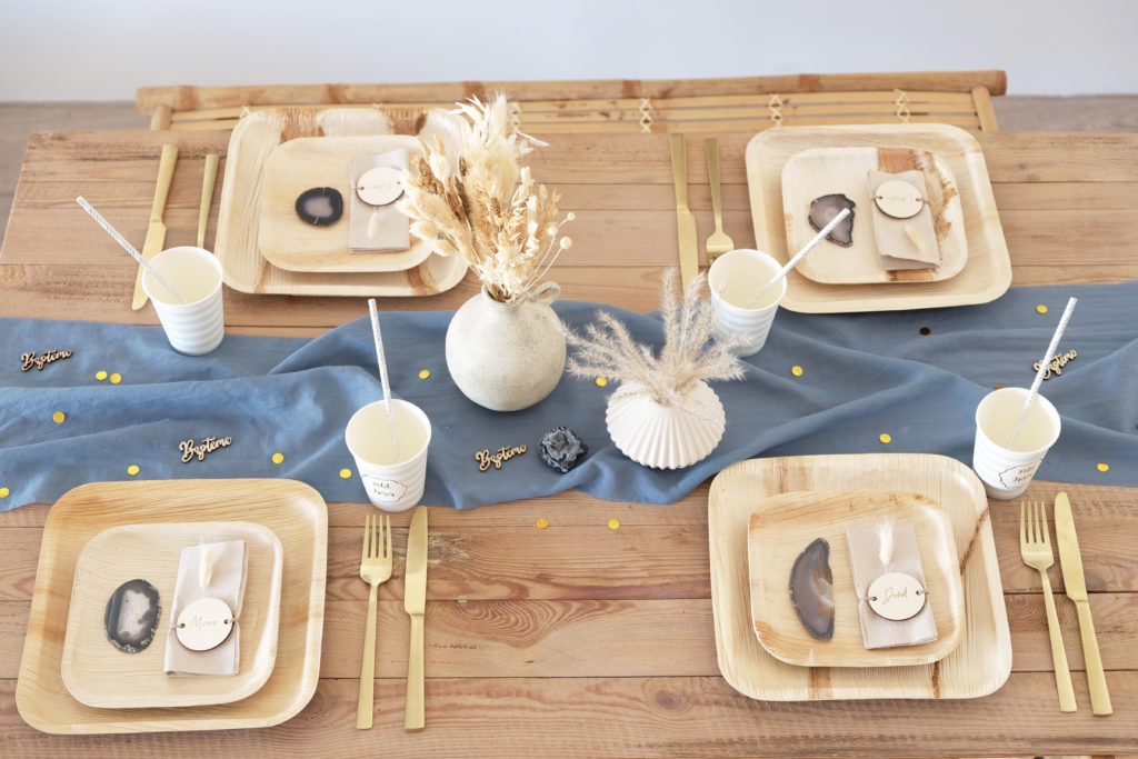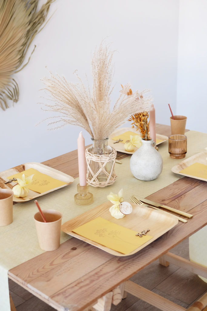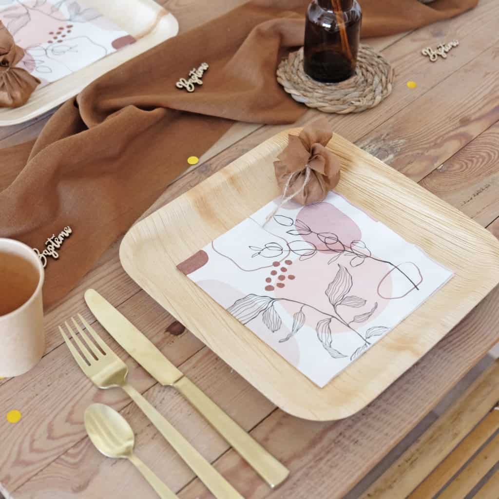 De belles assiettes en carré écologiques en feuilles de palmier seront parfaites dans un thème un peu printanier. Des gobelets en carton couleur kraft, de belles serviettes jaunes fleurs de lin, des petits confettis en bois parsemés.
