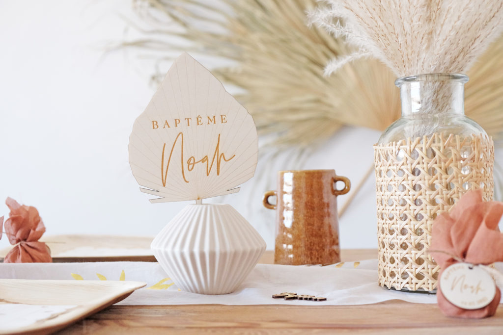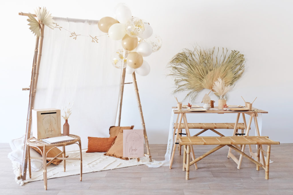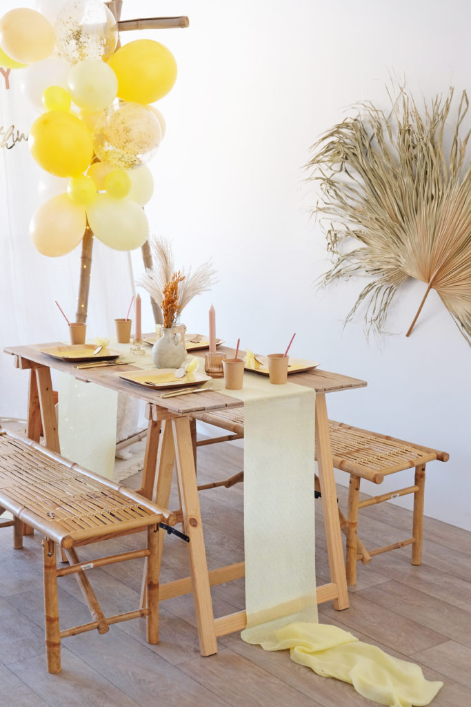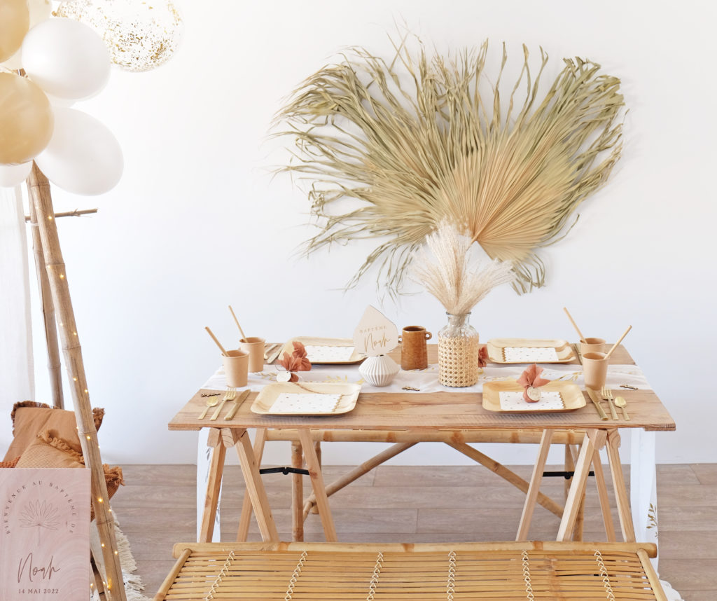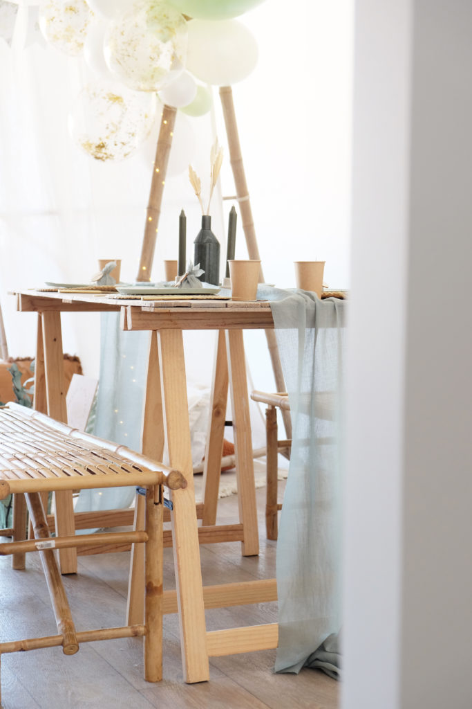 Quelques petites feuilles de palme naturelles, une guirlande en bois et le grand drapé en fond. Il s’agit d’une nappe en gaze de coton. Amusez-vous à changer la couleur de votre tissu en fonction de votre thème.