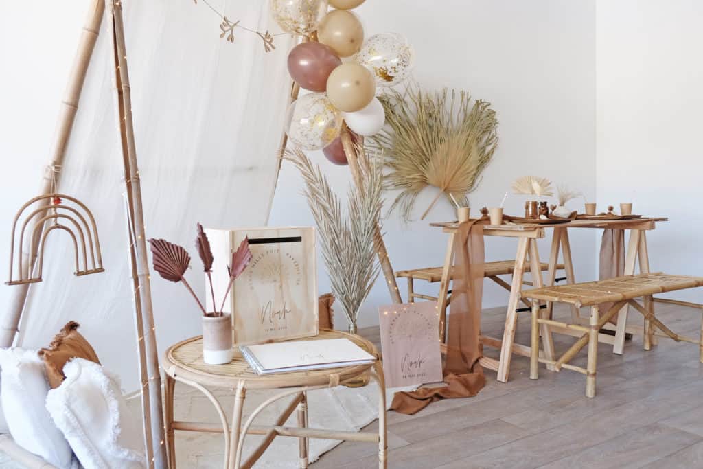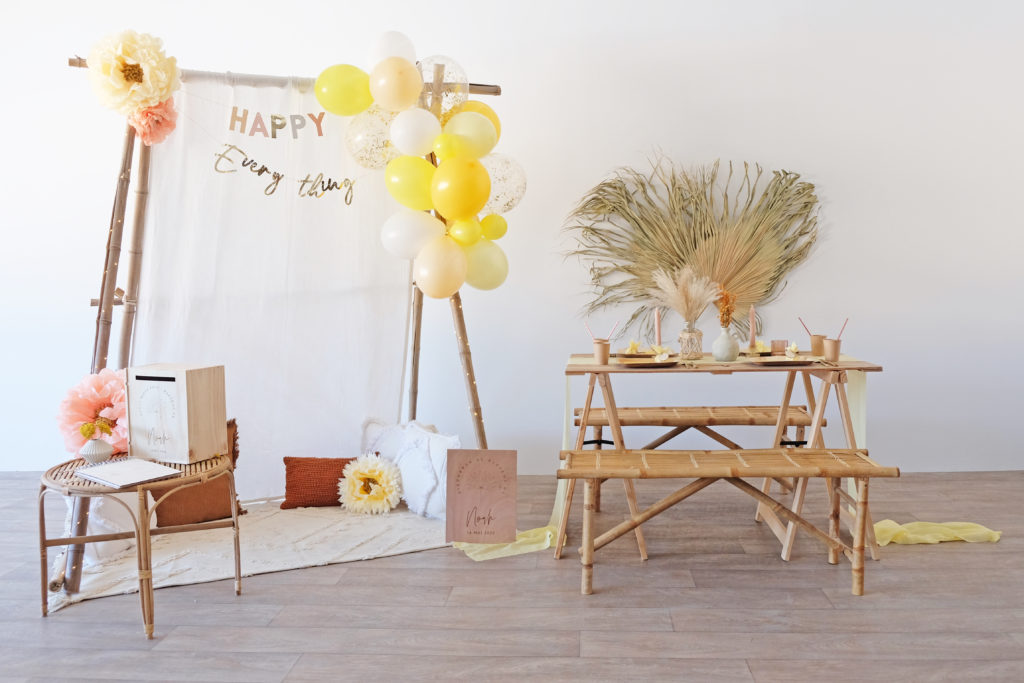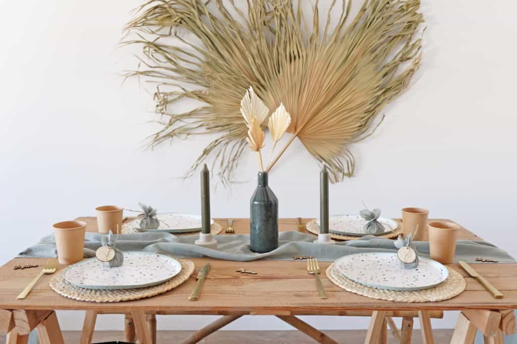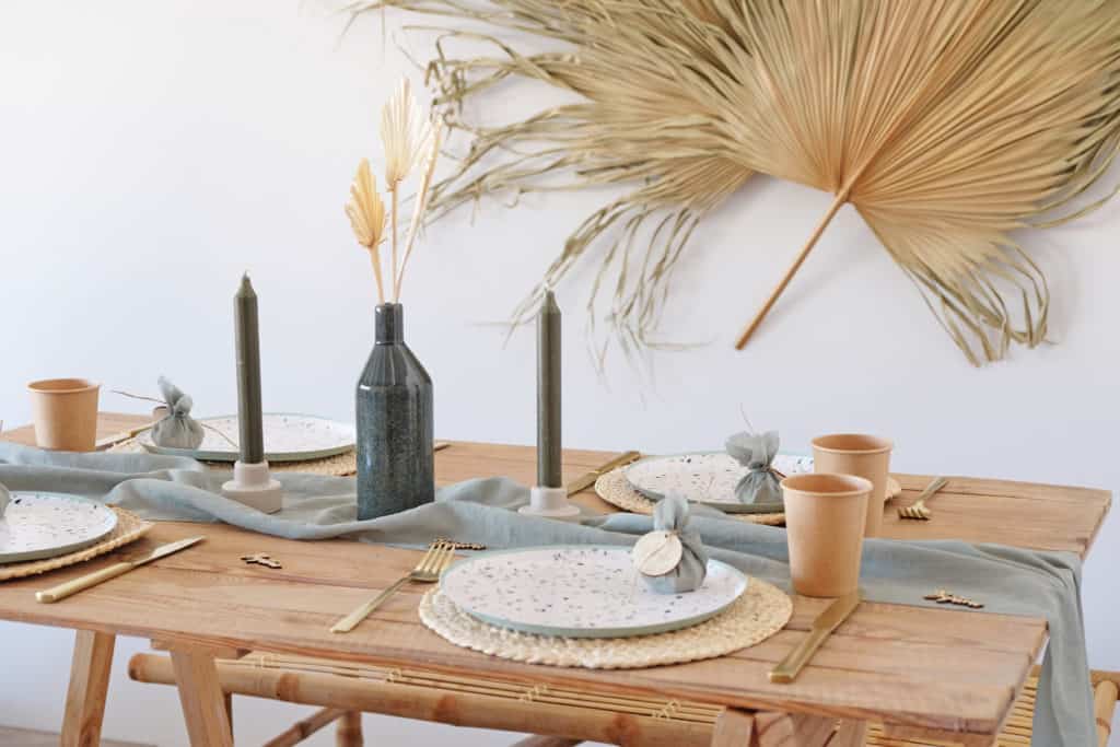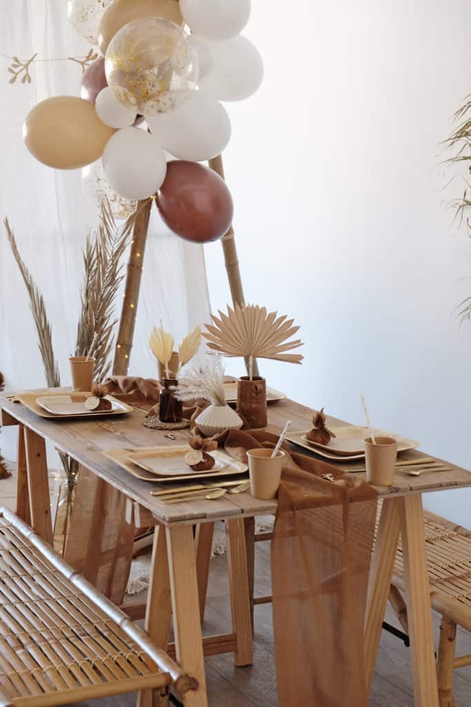 Quelques petites feuilles de palme naturelles, une guirlande en bois et le grand drapé en fond. Il s’agit d’une nappe en gaze de coton. Amusez-vous à changer la couleur de votre tissu en fonction de votre thème.
