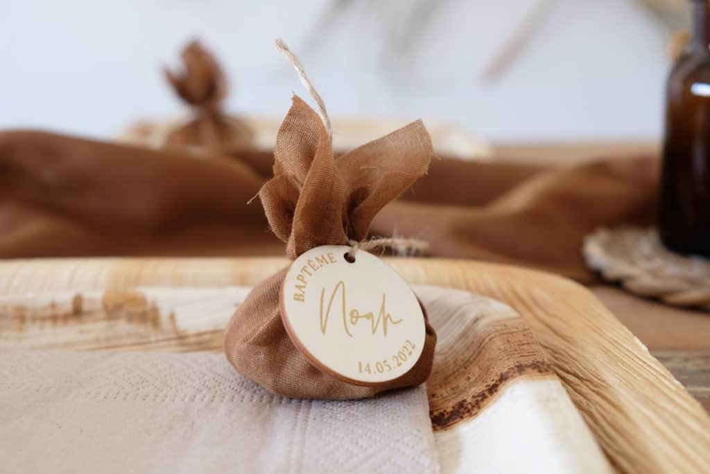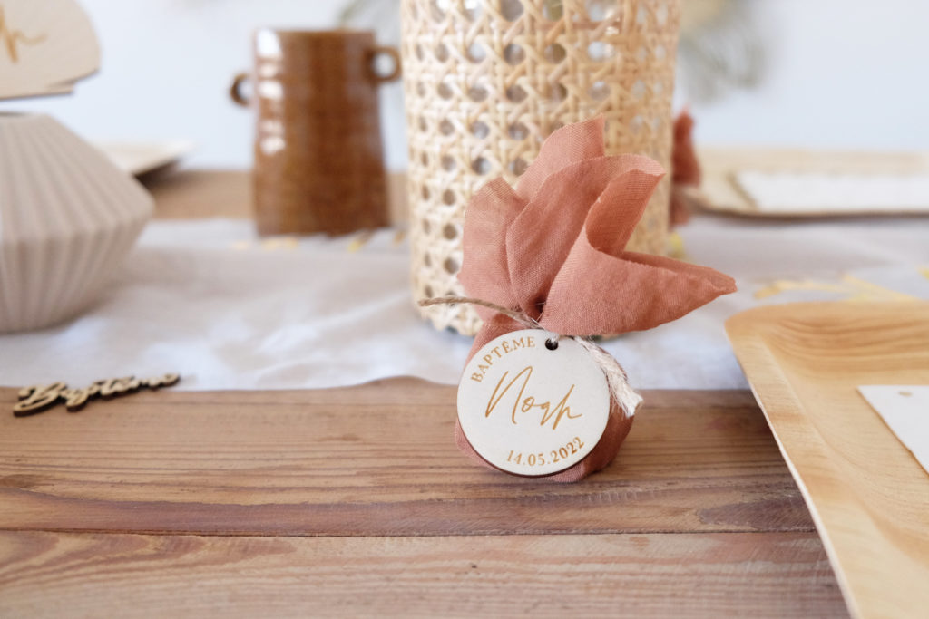 Juste ici, focus sur notre jolie idée de contenant à dragées ou cadeaux invités. Il s’agit d’un chemin de table en mousseline de coton couleur terre de sienne que nous avons coupé en carrés. Garnissez vos pochons et accrochez-y une belle étiquette en bois personnalisable.