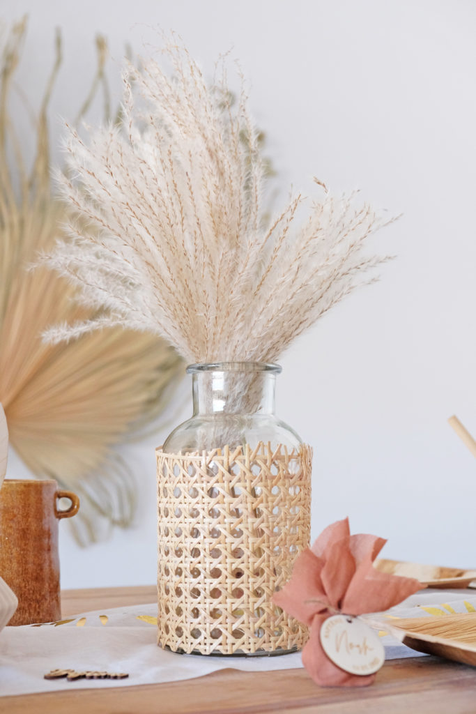 Le plus grand vase à côté est en verre et cannage. Nous y avons placé de jolis plumeaux.
