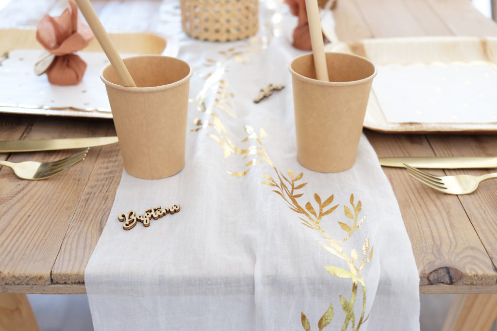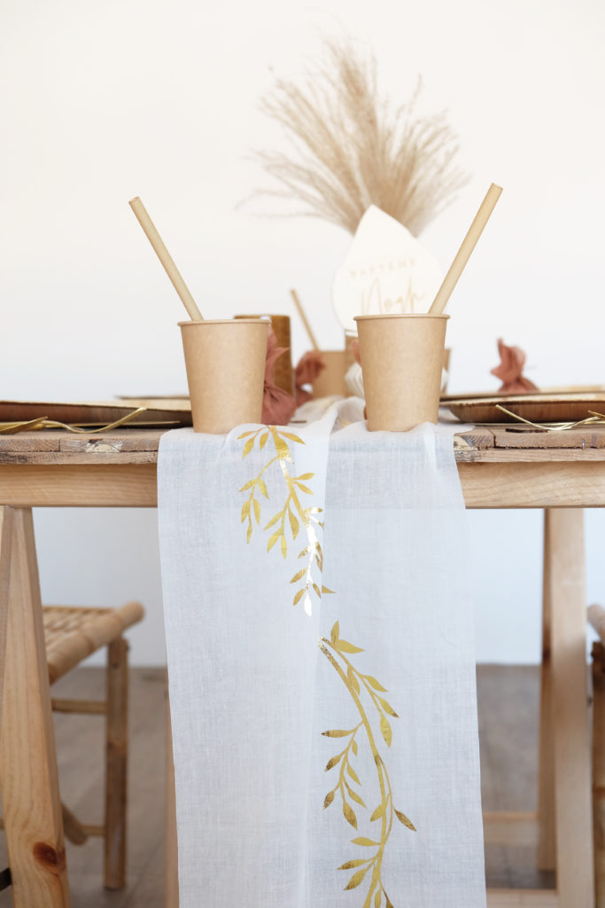 Commencez par installer un chemin de table en mousseline de coton blanc et détails feuilles dorées.