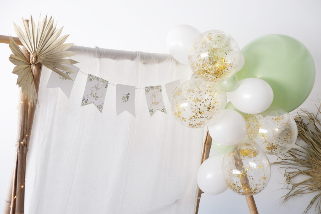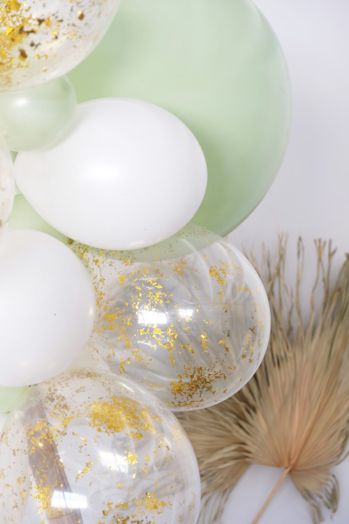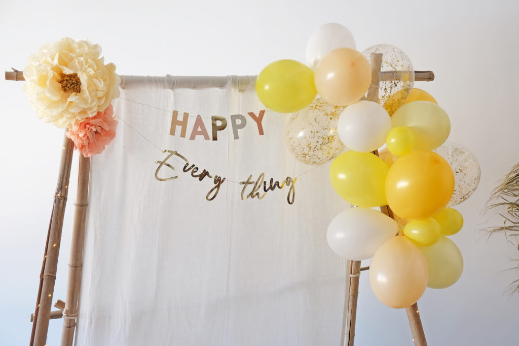 Une variante dans les teintes de la guirlande de ballons suspendue ! Mêlez des ballons jaune, jaune pastel, blanc mais aussi transparents et confettis dorés.
