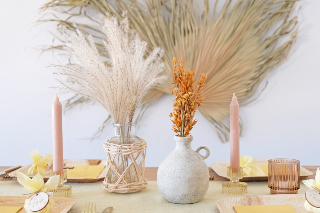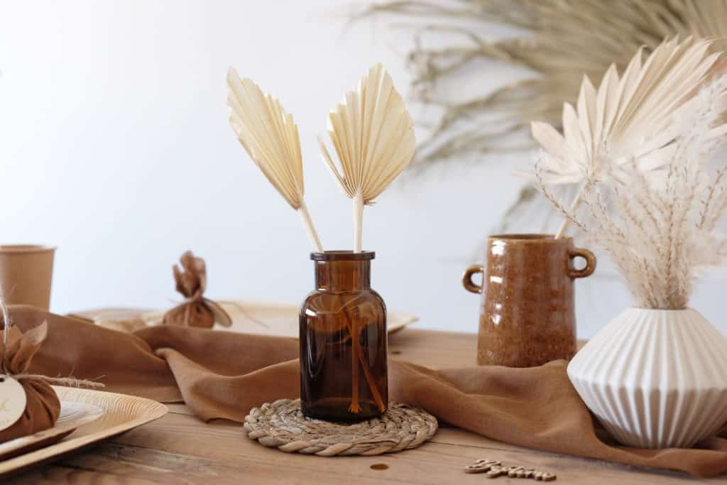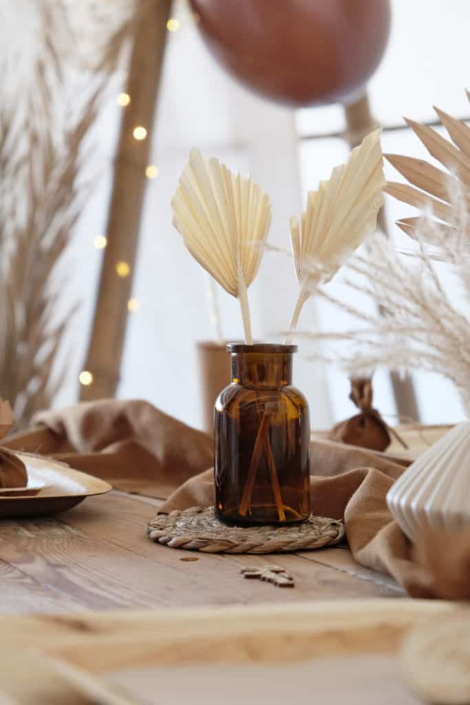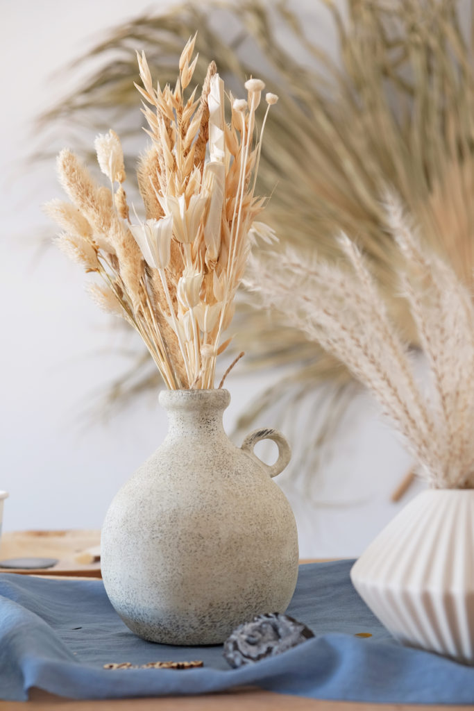 Décorez la petite table d’un joli petit vase en grès couleur terracotta. Nous y avons placé de beaux petits plumeaux lagurus blancs.