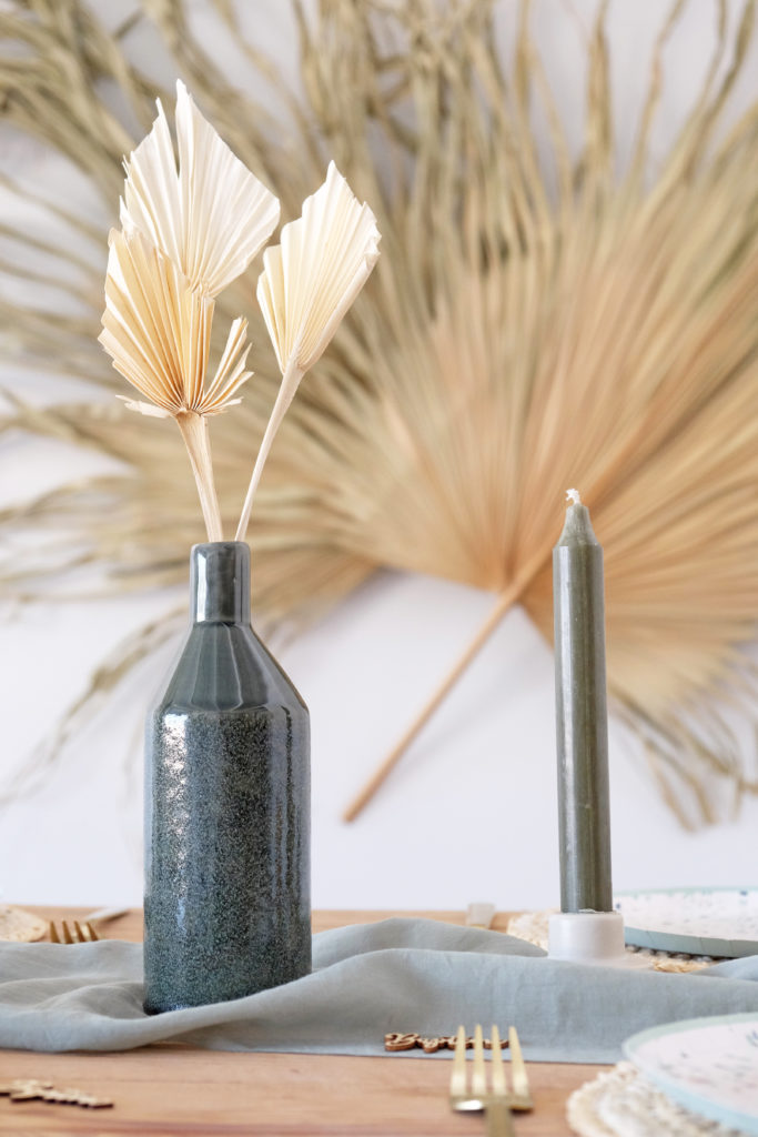Un beau vase en grès de couleur vert botanique trouve place au centre de la table.