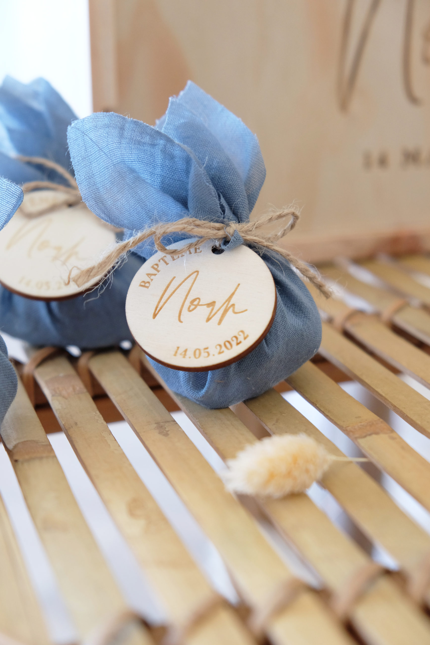 Le fameux petit pochon avec étiquette en bois personnalisable est à retrouver ici pour chacun des convives. Il est confectionné à l’aide de notre même chemin de table et prêt à être garni de gourmandises, dragées, thé, pot pourri…