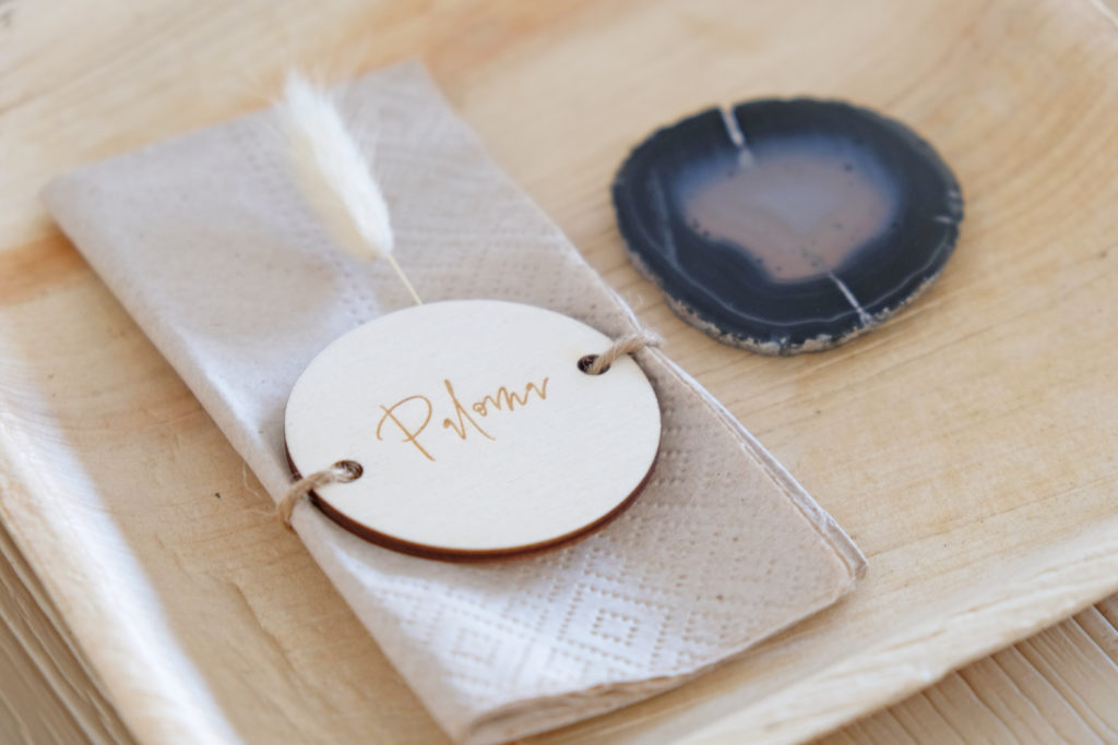 De beaux marque-places personnalisables accompagnés d’une jolie pierre semi-précieuse d’agate naturelle pour créer une ambiance unique.