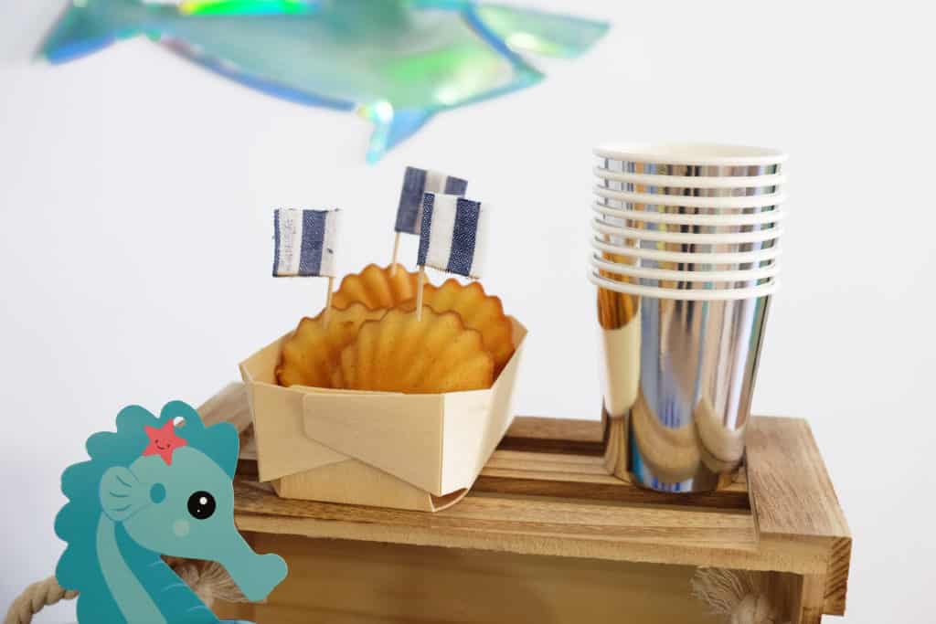 Bon ok nous nous sommes régalées à utiliser des madeleines en forme de coquillages ! Nous les avons disposées dans une belle petite caissette en bois et à côté les gobelets argentés attendent leur tour 🙂