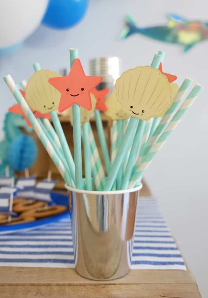 Utilisez ensuite un des jolis gobelets argentés pour y mettre vos pailles de la mer ! Coquillage et étoile de mer trouveront facilement leur place au bout des pailles 🙂