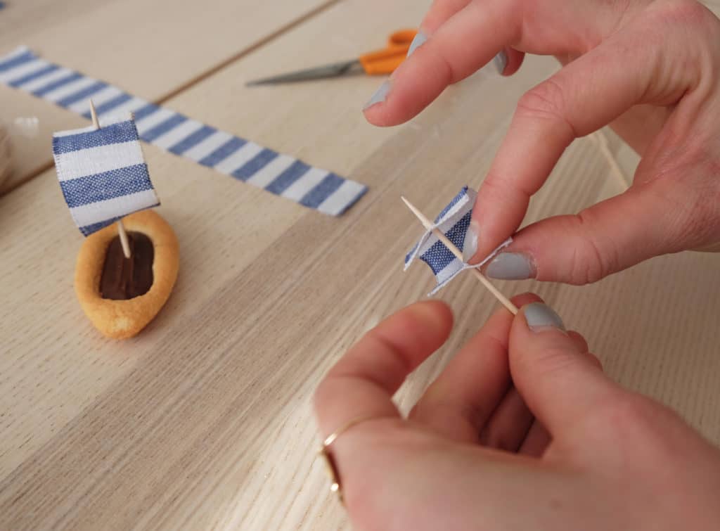 Plantez un cure-dents dans chacun des morceaux découpés et orientez votre morceau de tissu de façon à ce que cela représente une sorte de voile gonflée par le vent.