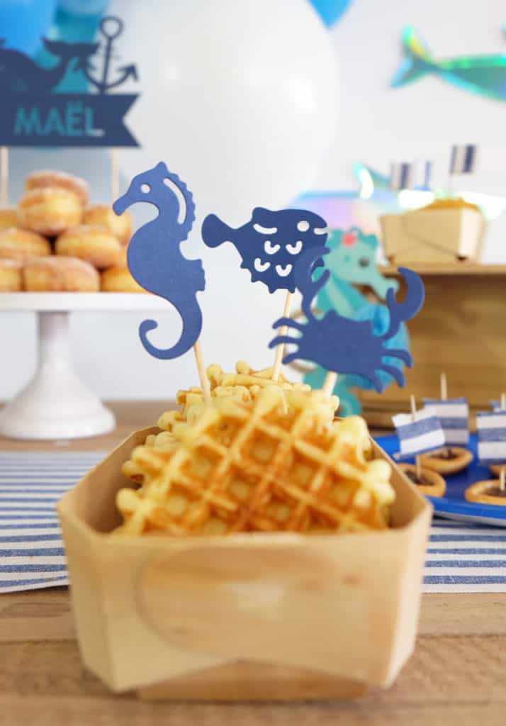 Nous avons disposé des petites gaufres dans de jolies petites caissettes en bois. Sur lesquelles nous avons planté des petites décorations sur le thème de la mer (hippocampes, crabes, poissons…) tout le monde est réuni pour faire la fête ! 🙂