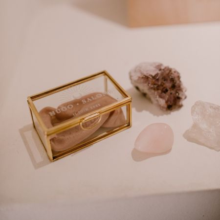 N'oubliez pas de sauvegarder votre personnalisation pour pouvoir l'ajouter au panierCette jolie boîte rectangulaire en verre et métal doré sera parfaite pour présenter vos alliances pour la cérémonie.