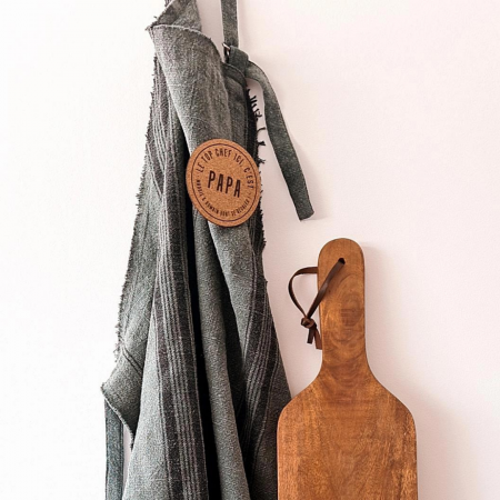 Ce tablier effet lin est vendu avec une broche en liège "Le top chef ici c'est papa. ... va/vont se régaler".