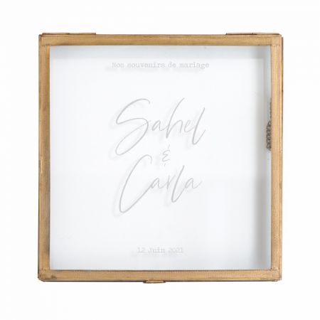 N'oubliez pas de sauvegarder votre personnalisation pour pouvoir l'ajouter au panierCette grande boîte en verre et métal couleur or vieilli est ornée d'une frise de gravures vintage sur le dessus. Elle est gravée avec la phrase "Nos souvenirs de mariage" et est personnalisable avec vos prénoms et la date du mariage.