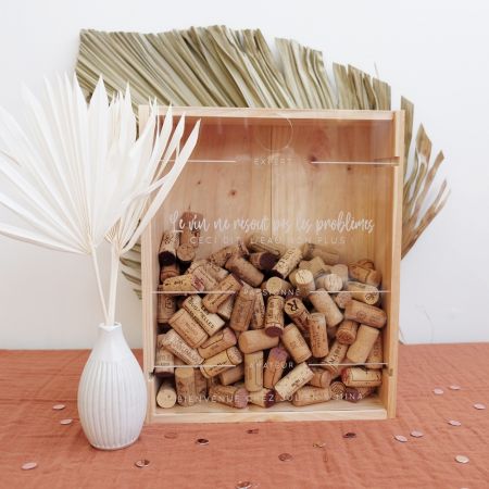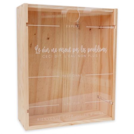 Son couvercle transparent en plexiglas est gravé avec différents niveaux à atteindre: amateur, passionné et expert. Il est également gravé de la phrase "Le vin ne résout pas les problèmes. Ceci dit, l'eau non plus". Cette phrase n'est pas personnalisable mais vous pouvez inscrire ce que vous voulez (dans la limite de 30 caractères, espaces compris) en bas du cadre. Par exemple: "ROMAIN - 30 ANS", "CREMAILLERE JULIEN & MINA", "BONNE FETE PAPA"...