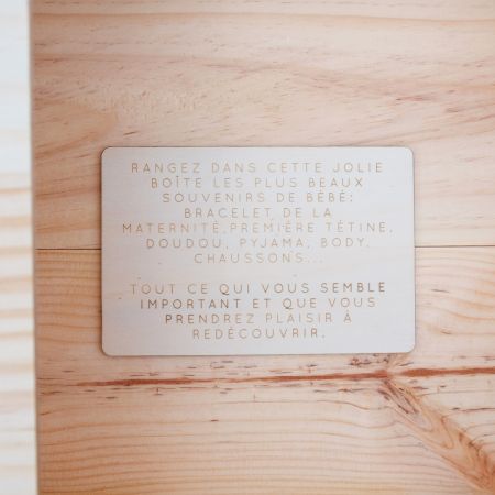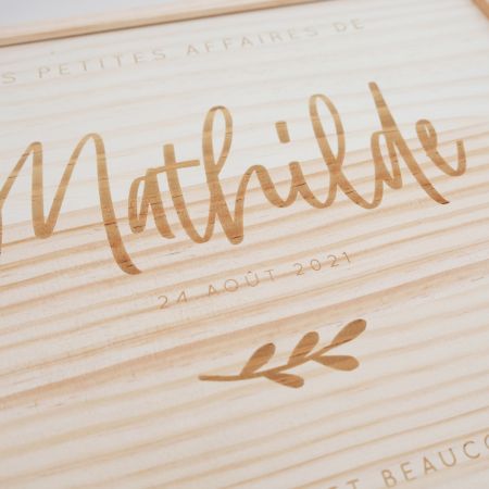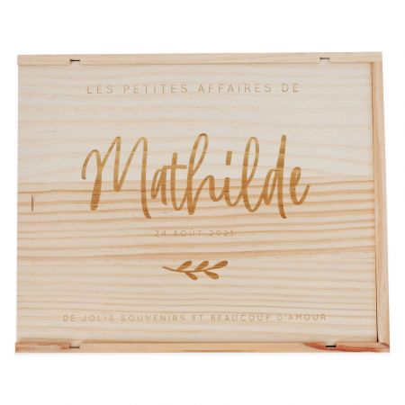 Elle est gravée des phrases "Les petites affaires de...", "De jolis souvenirs et beaucoup d'amour" et personnalisable avec le prénom de l'enfant et sa date de naissance. Elle est également décorée d'un joli motif végétal.