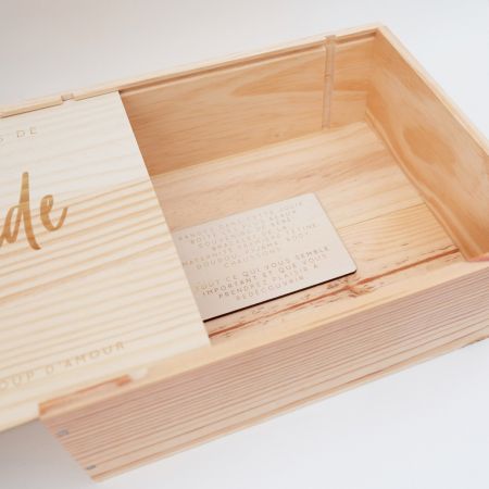 Note : il s'agit d'une caisse à vin détournée, fabriquée à la main, chaque boîte est donc unique, il peut y avoir des variations de teintes, de légères fissures, de petites différences de taille, ou un décalage au niveau du couvercle.