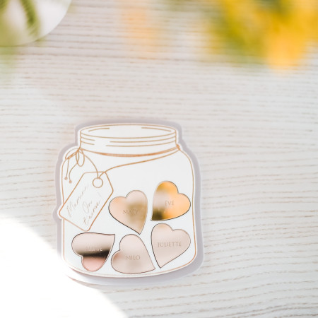 Les cœurs en plexiglas miroir rose gold accueillent les prénoms des petits-enfants et sont soigneusement disposés dans le pot, symbolisant tout l'amour qu’ils portent à leur grand-mère.