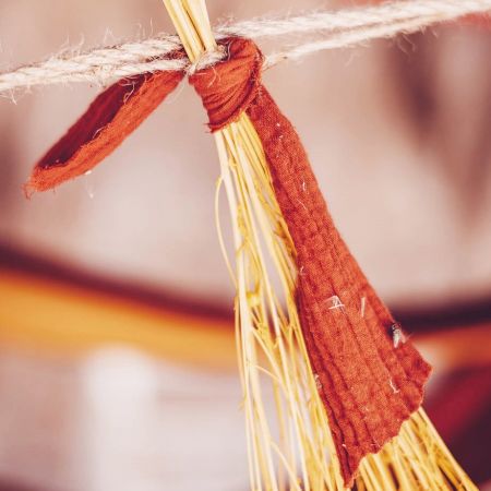 Les bords du chemin de table sont laissés bruts et sans couture pour un effet bohème et tendance.
