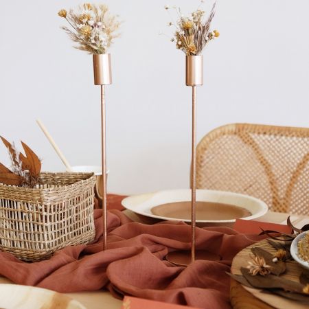 Pour un mariage bohème et tendance, installez-le sur des tables en bois avec en son centre des vases et soliflores de plusieurs tailles et couleurs remplis de fleurs séchées. Ajoutez le nom de table, les marque-places, quelques photophores et bougies ainsi que la vaisselle et votre décoration de table de mariage sera parfaite !