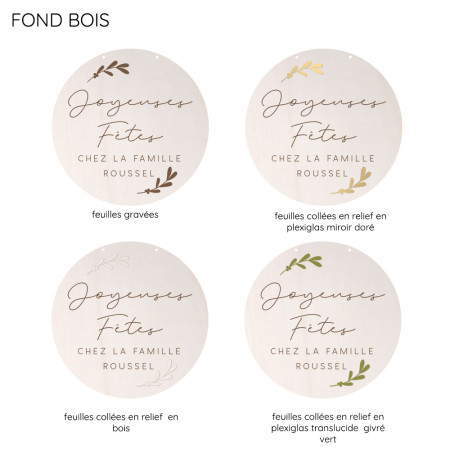 A vous de choisir la matière de la décoration, en bois ou parmi différents plexiglas, la matière des petites feuilles, ainsi que le ruban pour le suspendre.