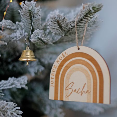 Cette décoration de sapin est personnalisable avec le prénom de votre choix, vous pouvez également choisir entre les mots "Joyeux Noël", "Mon premier Noël" ou "Noël + l'année".