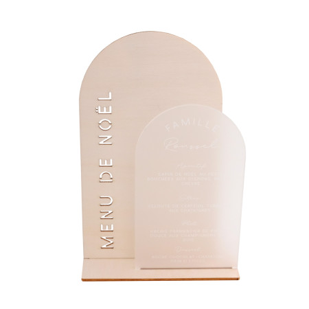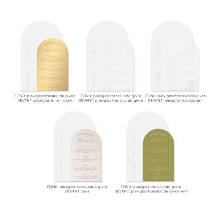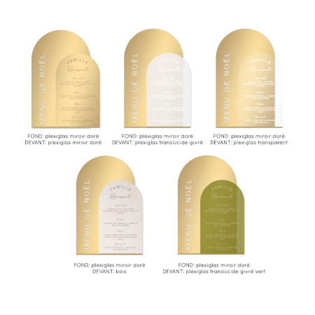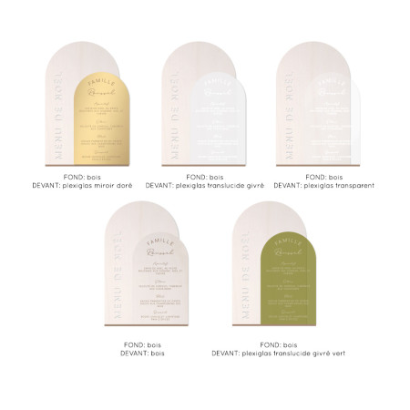 Amusez vous à mixer les matières: composez votre menu sur mesure en choisissant les matières et couleurs des deux parties: bois, plexiglas transparent, plexiglas translucide givré, plexiglas miroir doré, plexiglas translucide givré vert.